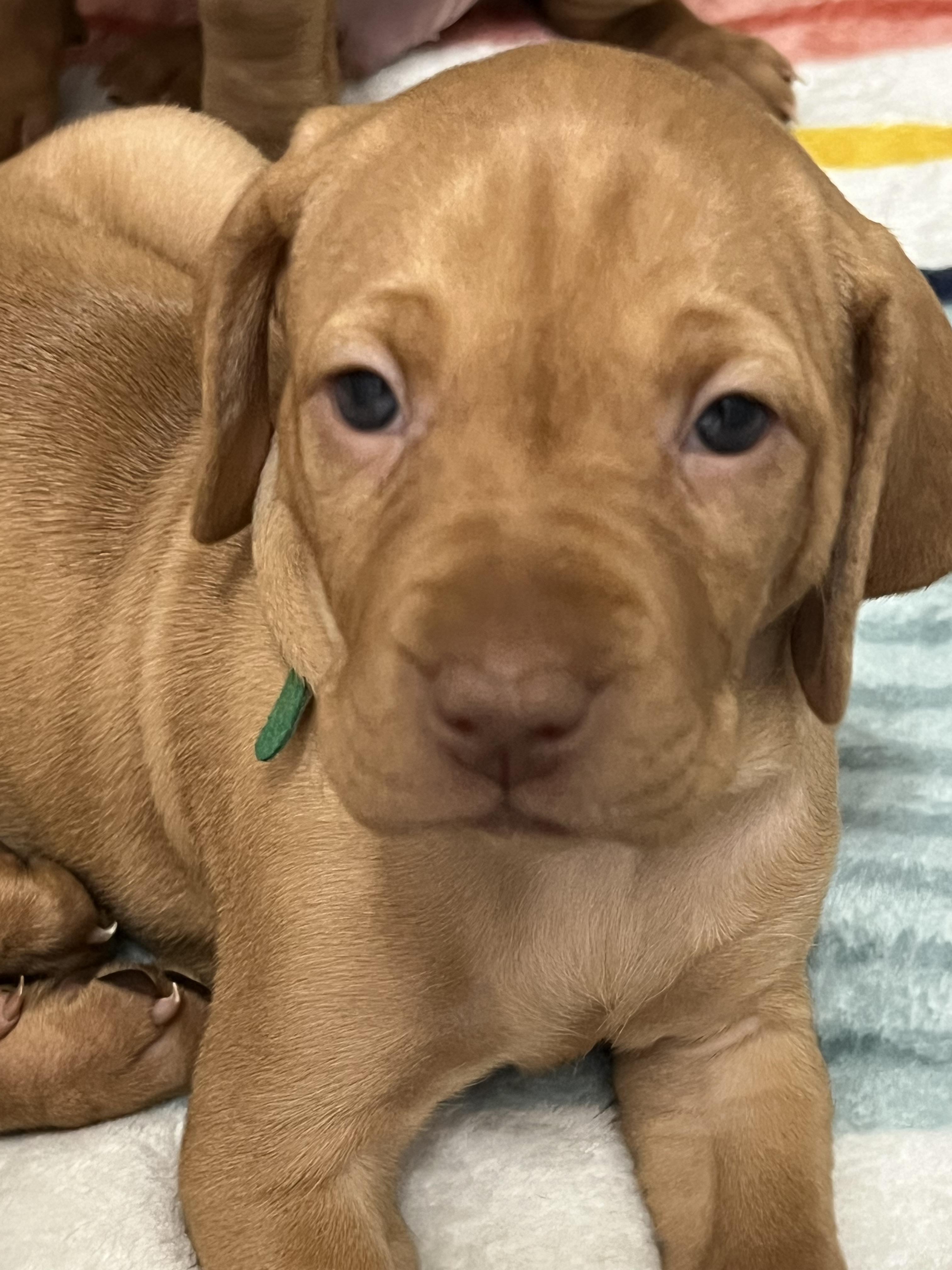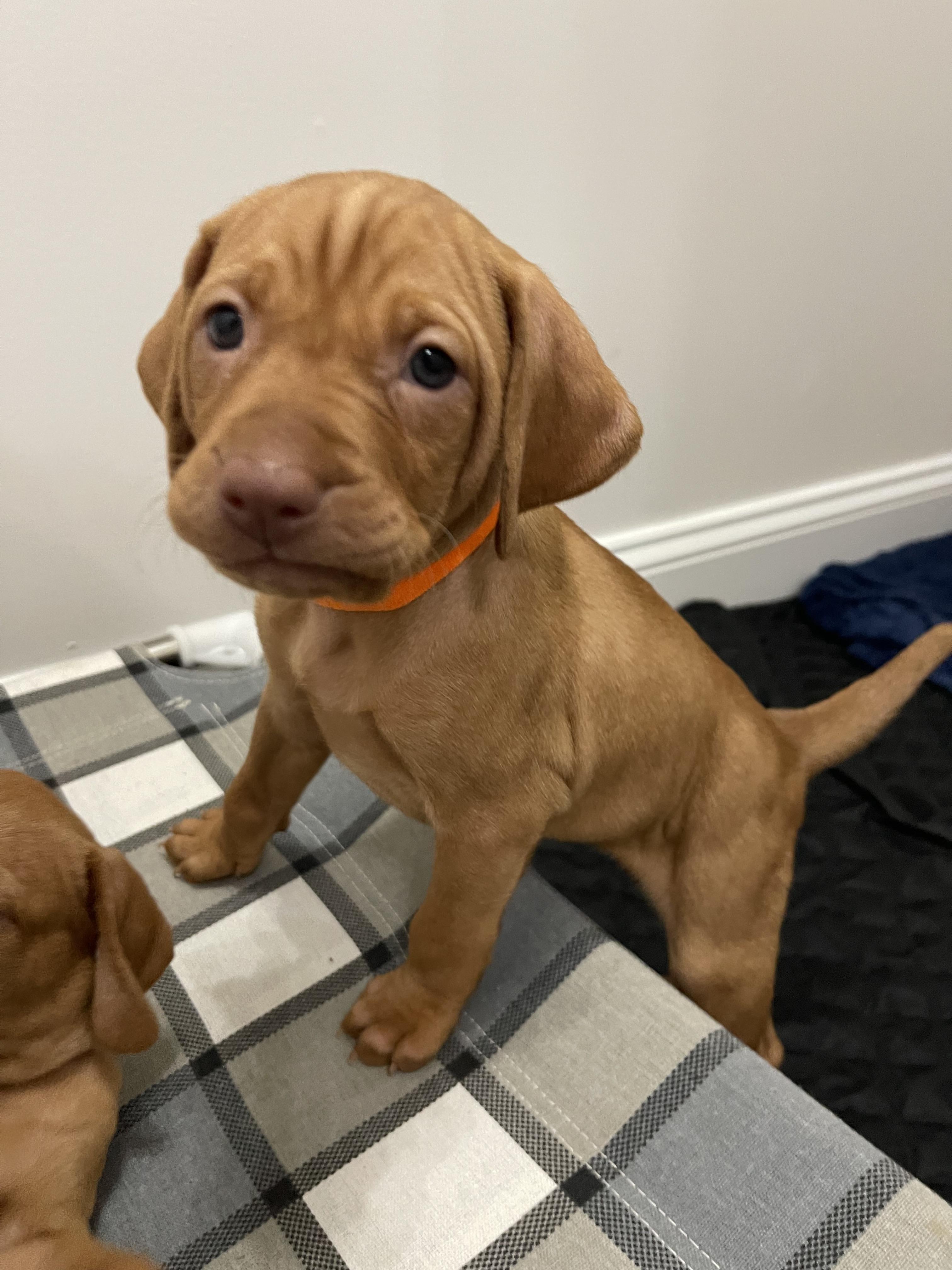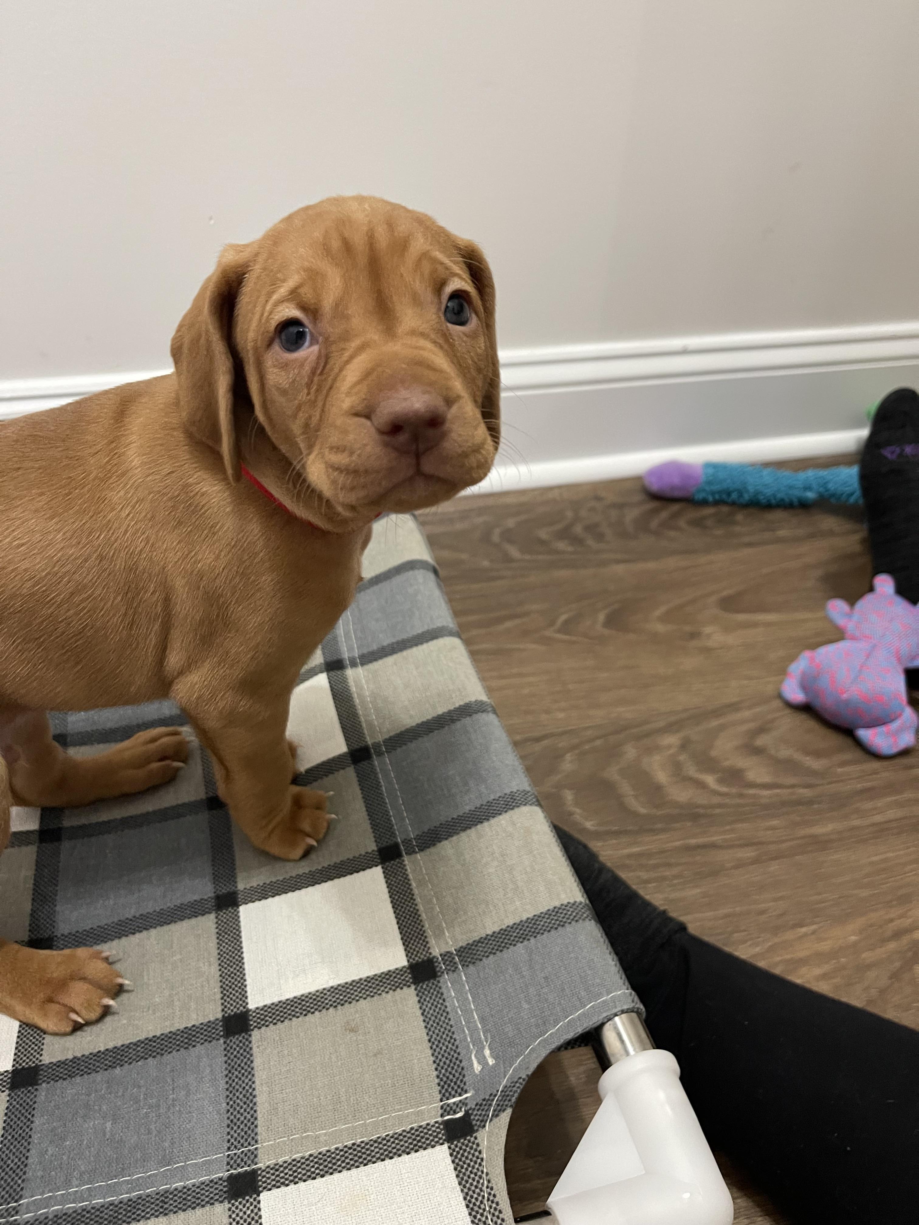 Cooper is a gentle sole with an amazing energy. He is a loving, loyal, energetic companion. His favorite activity is to fetch a ball or frisbee and has a natural instinct to point and watch birds. Very social enjoys other dogs. Training was easy due to the breeds intelligence. He protects the family with his barks and at night he cuddles on the sofa. Love my Vizsla!