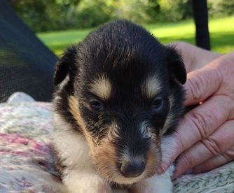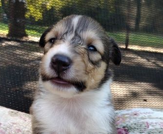 Collie puppies include black white and tan and sable and white. Miniature Australian Shepherd puppies include blue merle and black. Colors will vary depending on the parent dogs.