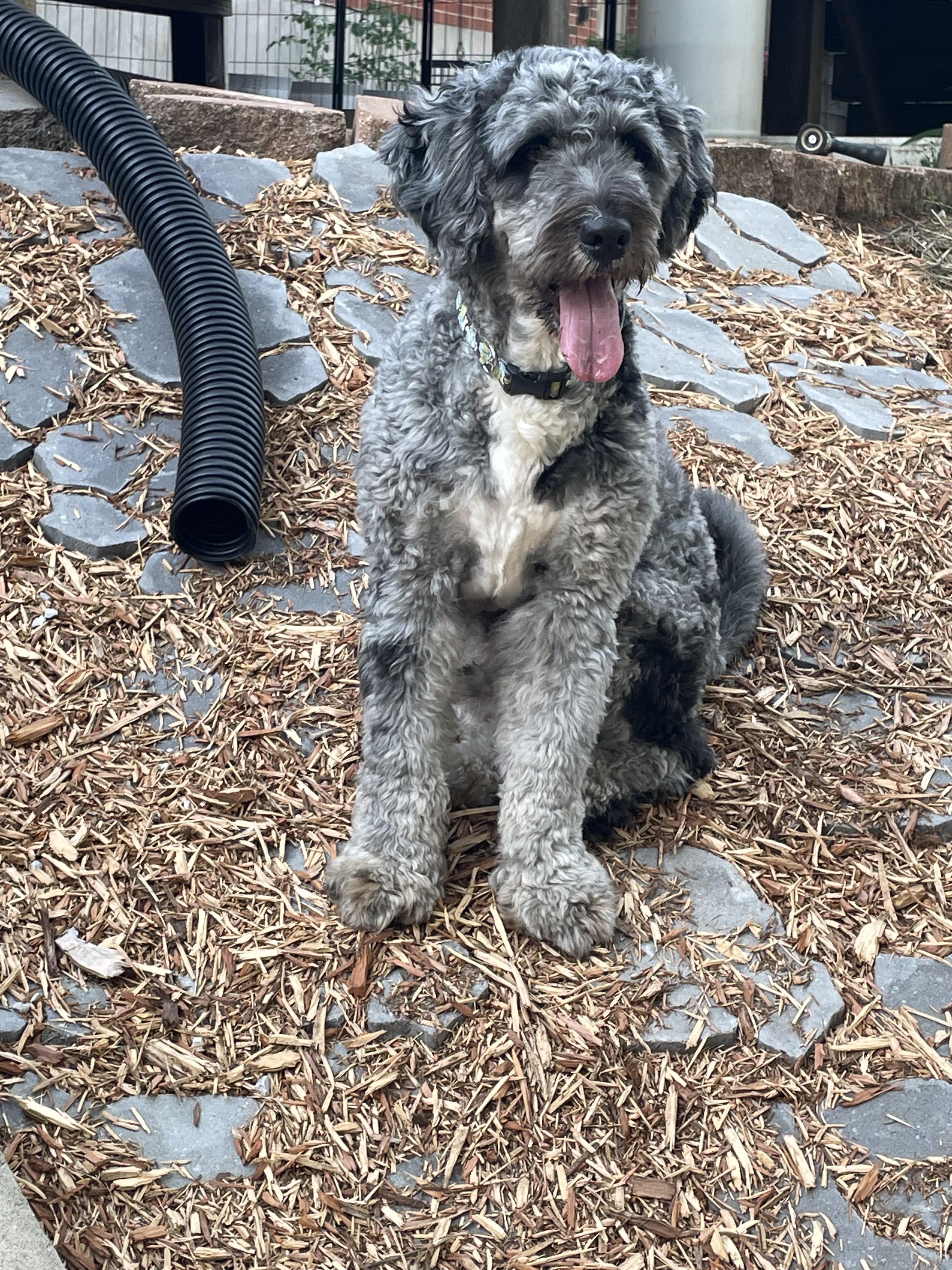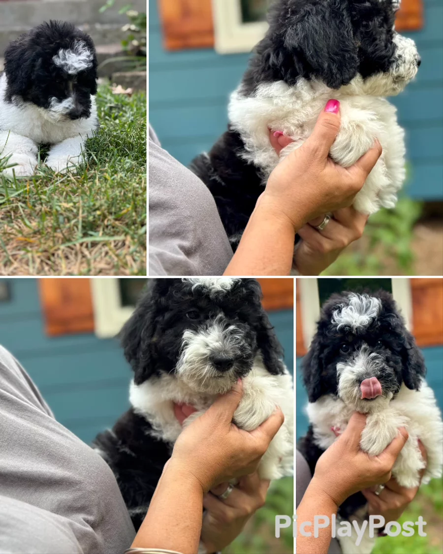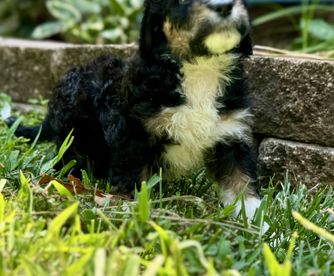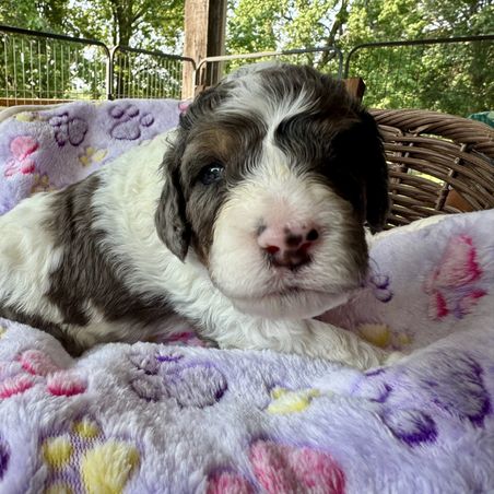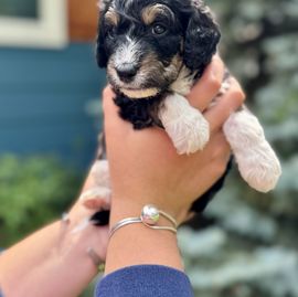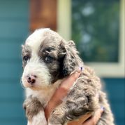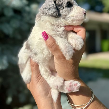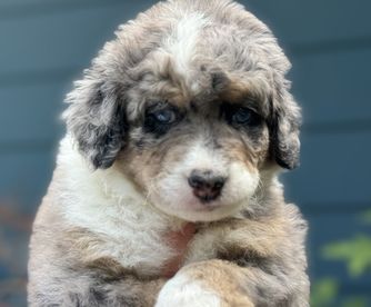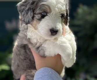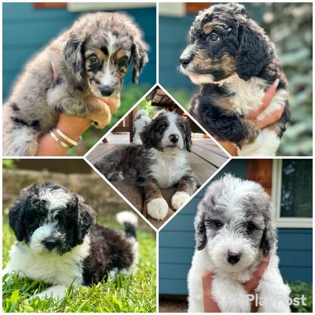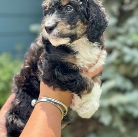 Our Bernedoodle puppies include brown, grey and white, chocolate merle, black and white, tri-color, phantom, blue merle, and merle. Aussiedoodle puppies include cream, brown and white, apricot, black and white, black tri-color, and red tri-color. Double Doodle puppies include merle, cream, chocolate, black, and phantom. Colors will vary depending on the parent dogs.