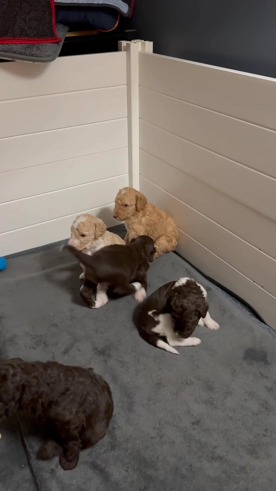 The puppies are five weeks old. They are doing wonderful. Eyes are open and they’ve been dewormed.