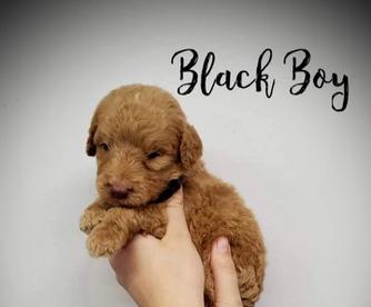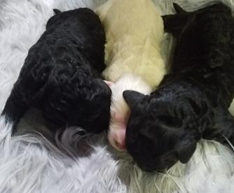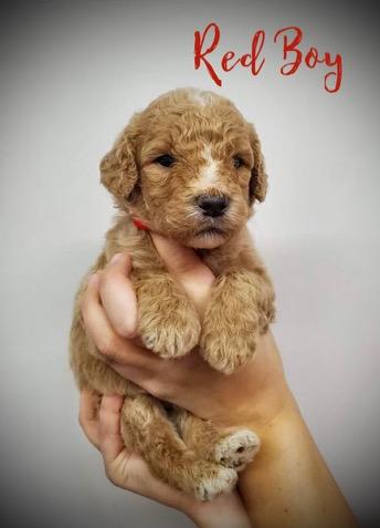 Our Goldendoodle puppies include cream, apricot, red, chocolate, and black. Bernedoodle puppies are tri-color. Colors will vary depending on the parent dogs.