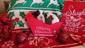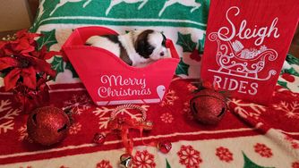 The sweet little boys are 5 weeks old and love to play and give kisses. They are eating wet food and drinking out of the water bottles. Trying to get them weaned from Mama. They love for me to get in their play yard with them and talk and play with them