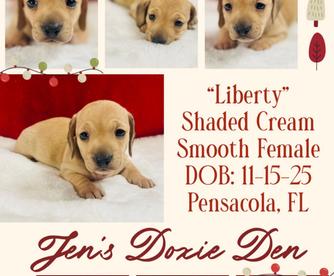 I'm Jennifer W., the breeder behind Jen's Doxie Den located in Pensacola, FL. We are a small program with high expectations! At this time, we only breed smooth haired miniature dachshunds. We strive to produce healthy, loving dogs that will excel in their forever homes. Our priorities when breeding are temperament, conformation, and health, and we ensure our breeding dogs come from quality bloodlines. It would be our pleasure to help you take the next step in adding this wonderful new addition to your family!