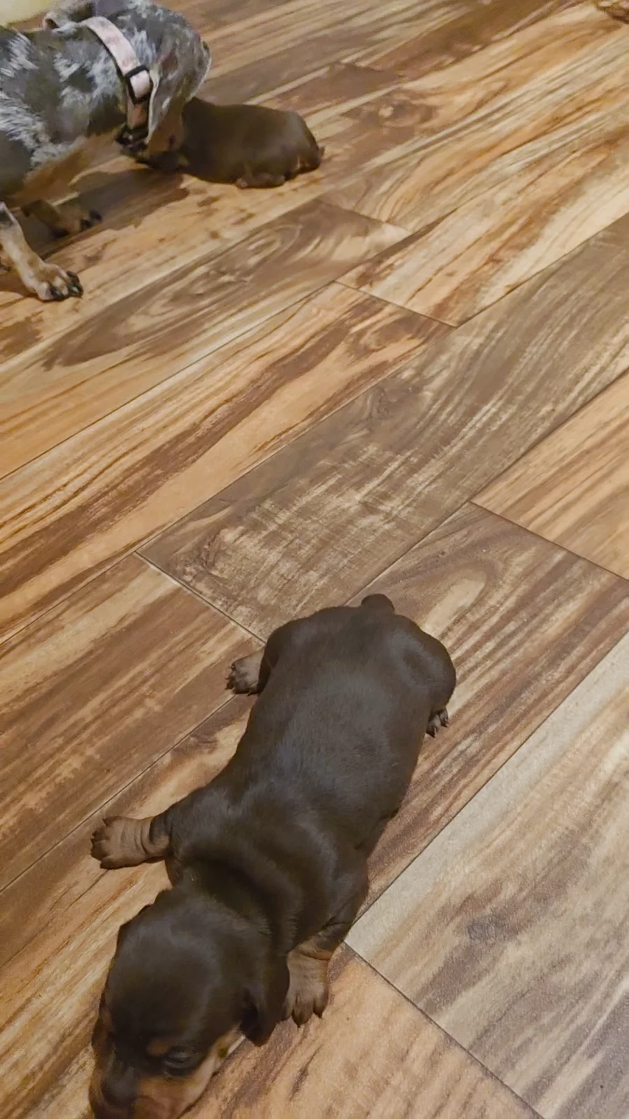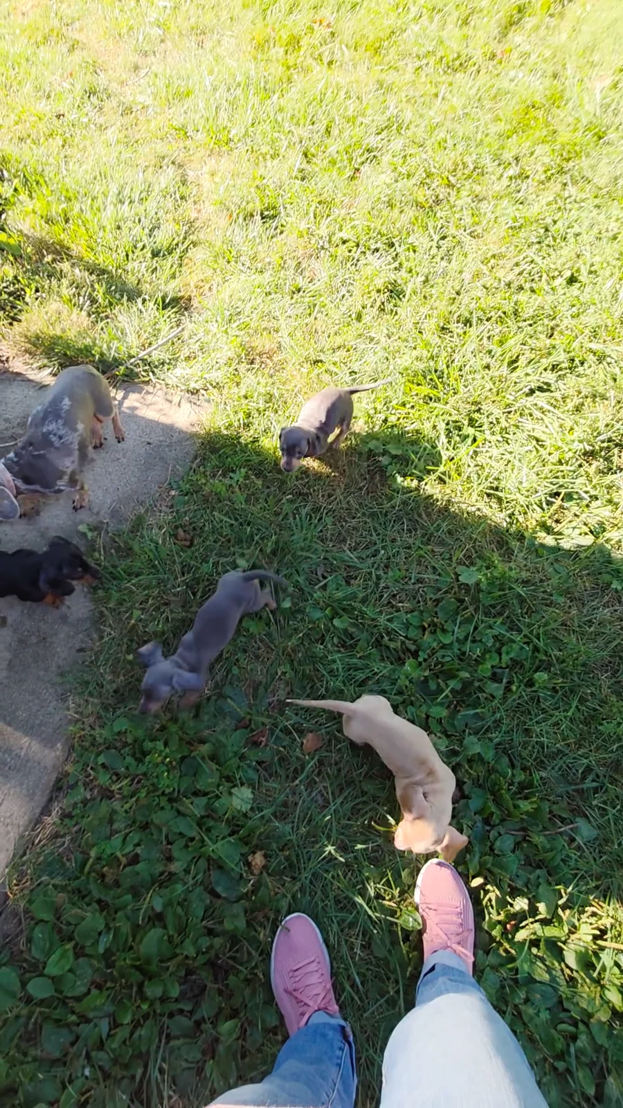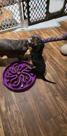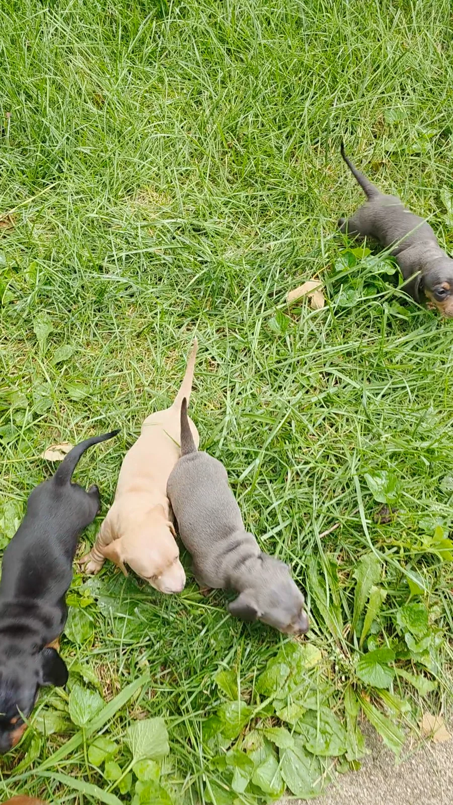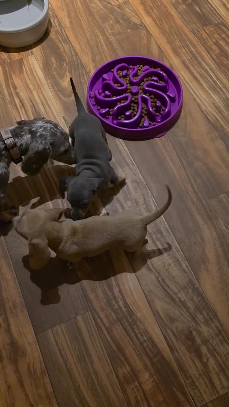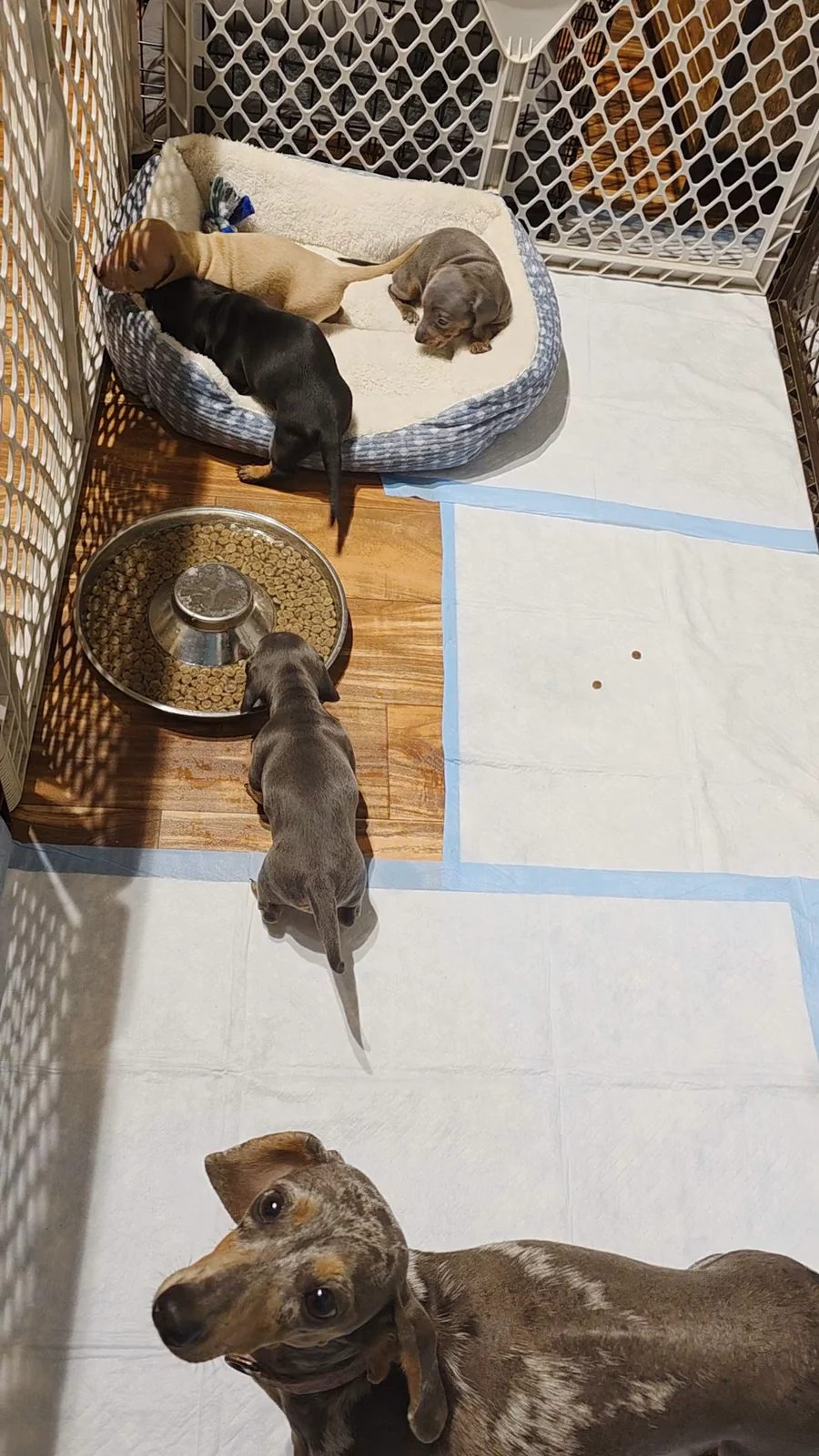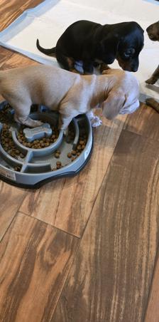 Pups all received baths and their 3rd round of dewormer this week. They continue to explore, play with puppy toys, and are more comfortable exploring outside. We are still working on puppy pad training as well as outside. They love to play and interact with each other and with my adult doxies. They are hilarious when eating as you can see in these photos. The love the different slowly feed bowls as it forces them to work for their food.