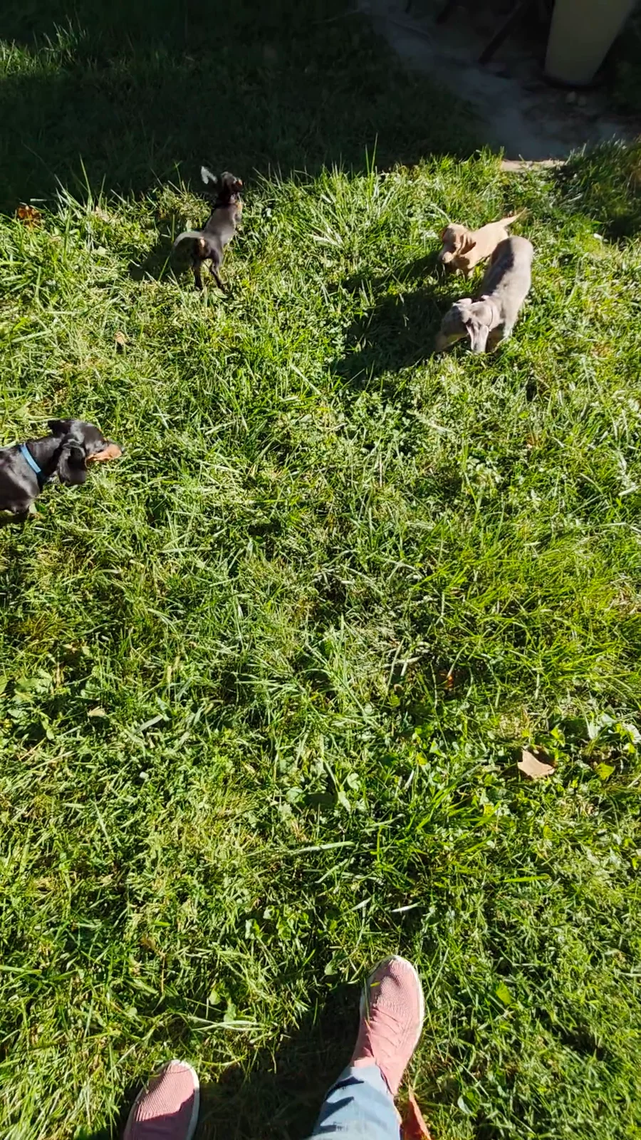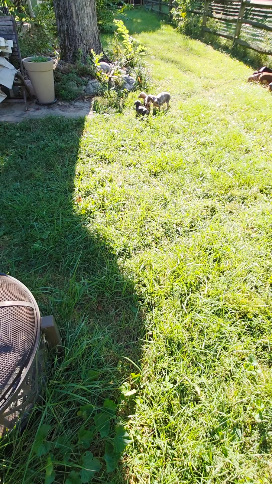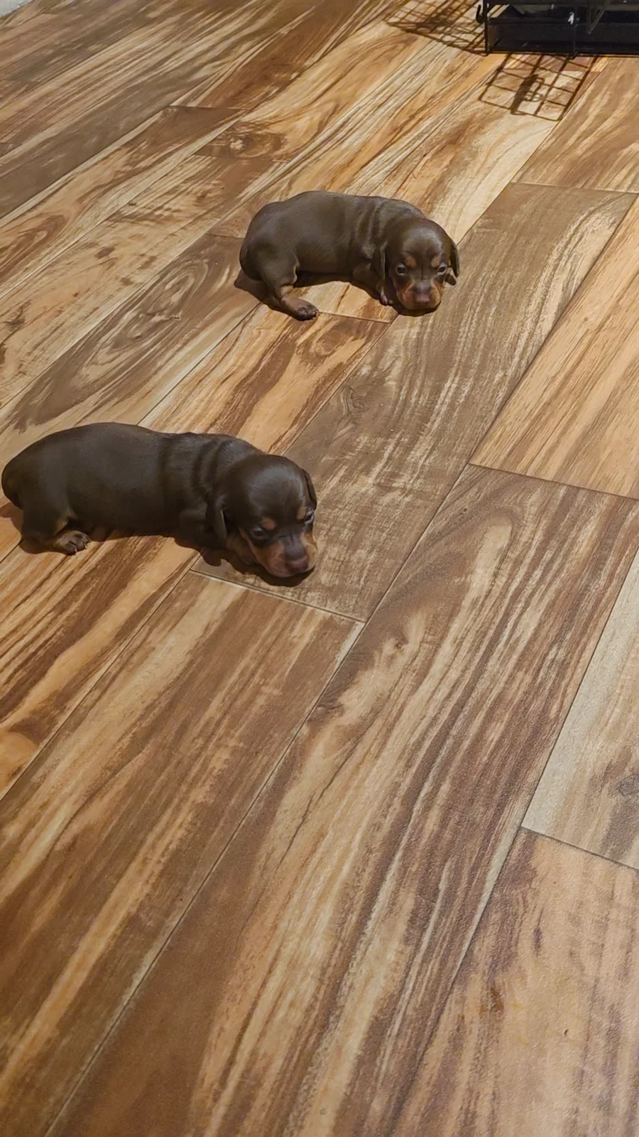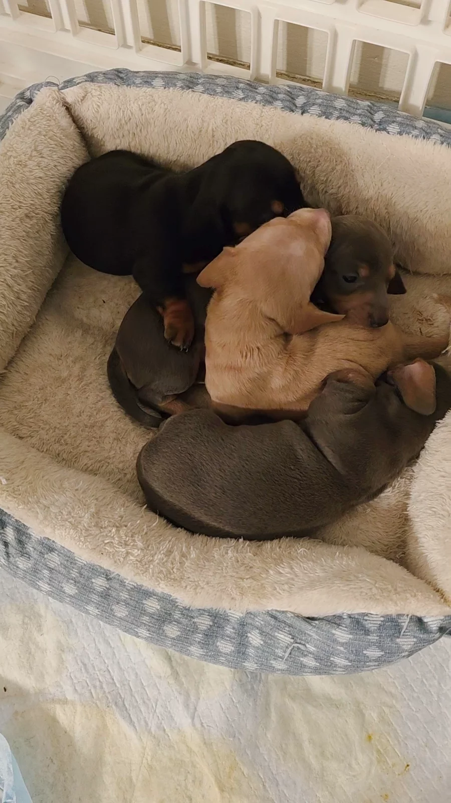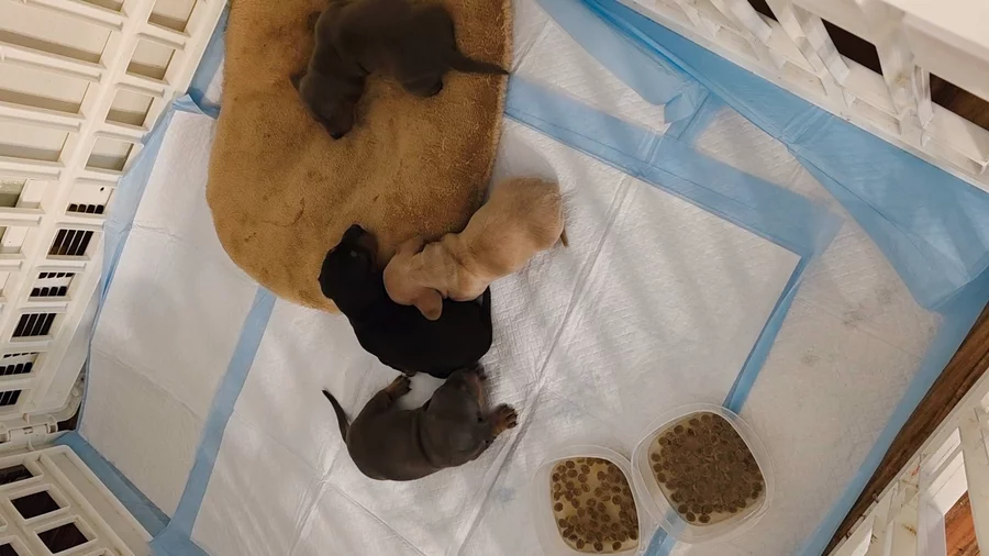 Pups all received baths and their 3rd round of dewormer this week. They continue to explore, play with puppy toys, and are more comfortable exploring outside. We are still working on puppy pad training as well as outside. They love to play and interact with each other and with my adult doxies. They are hilarious when eating as you can see in these photos. The love the different slowly feed bowls as it forces them to work for their food.