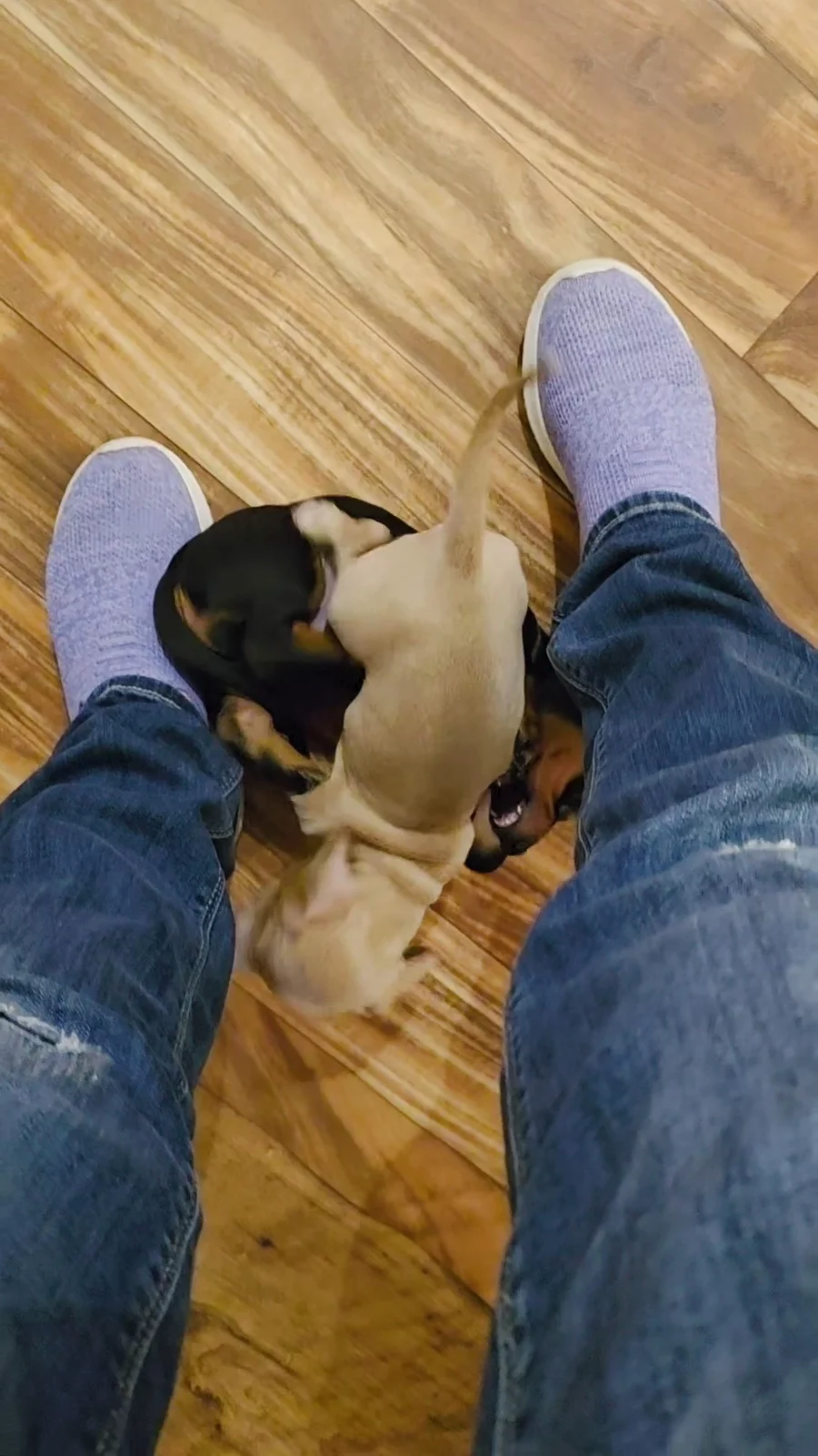 A quick sped-up video of puppy playtime. They have been trying to figure out how to get one of the treat toys to work.