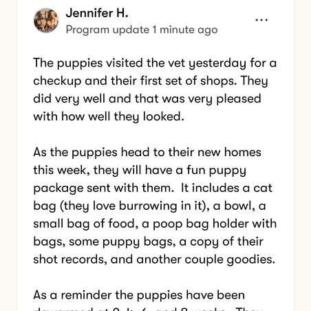 As the puppies had to their new homes this week they will have a fun puppy package sent home with them it includes a cat bag they love burrowing in it a bowl a small bag of food a puppy poop bag holder with bags some puppy pads, a copy of their shot records, and another couple goodies.