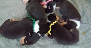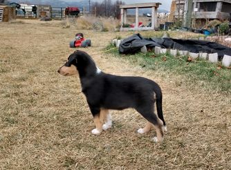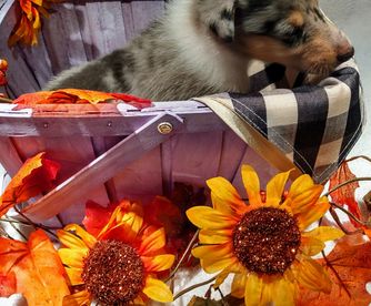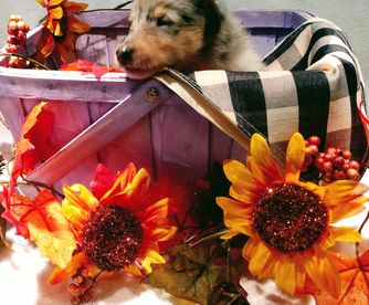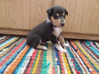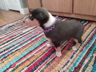 Our puppies include black white and tan and blue merle. Colors will vary depending on the parent dogs.