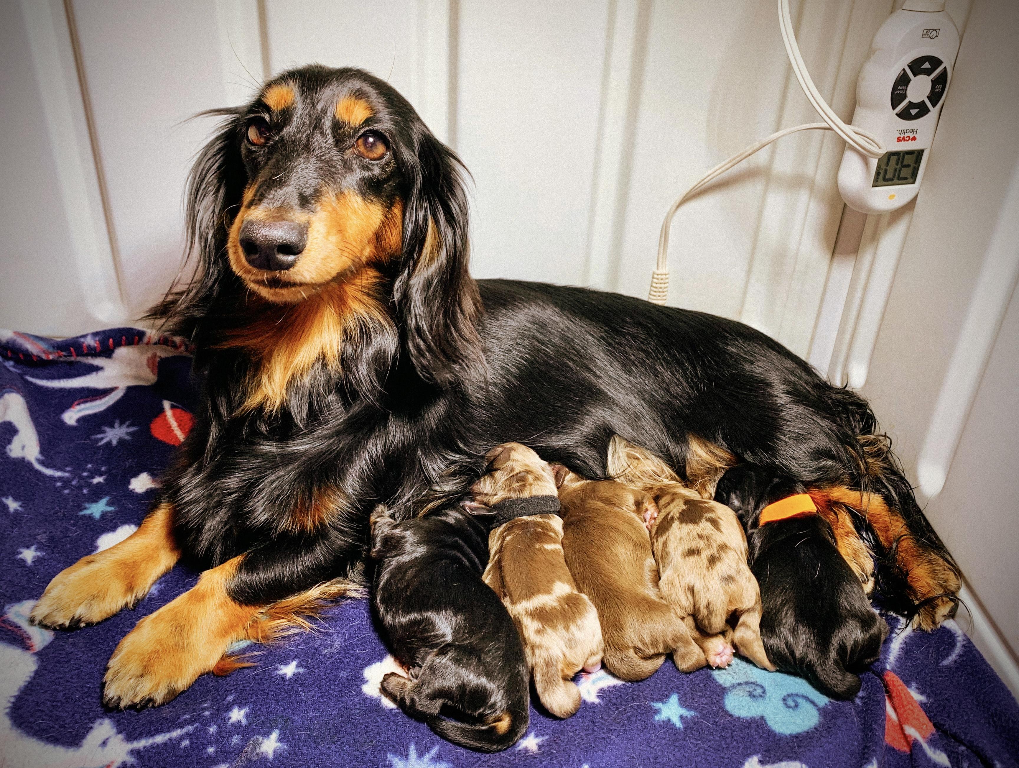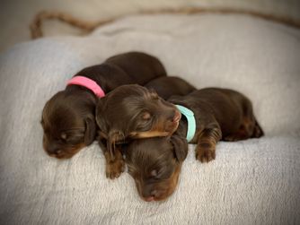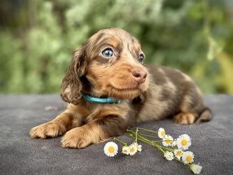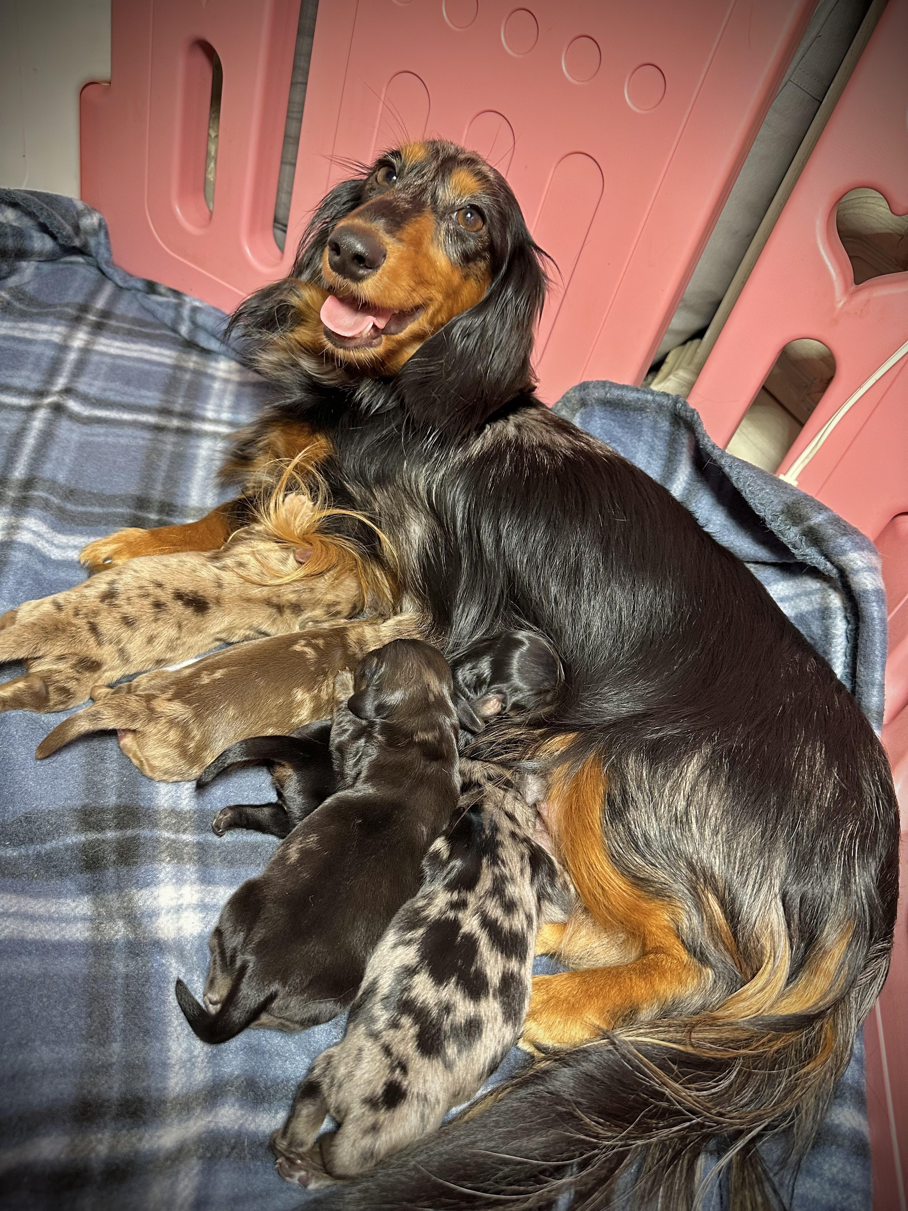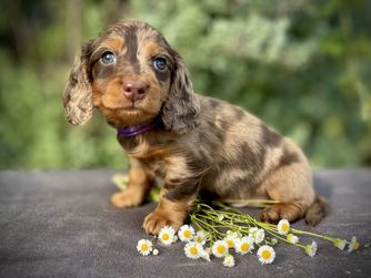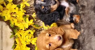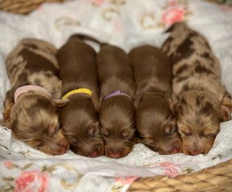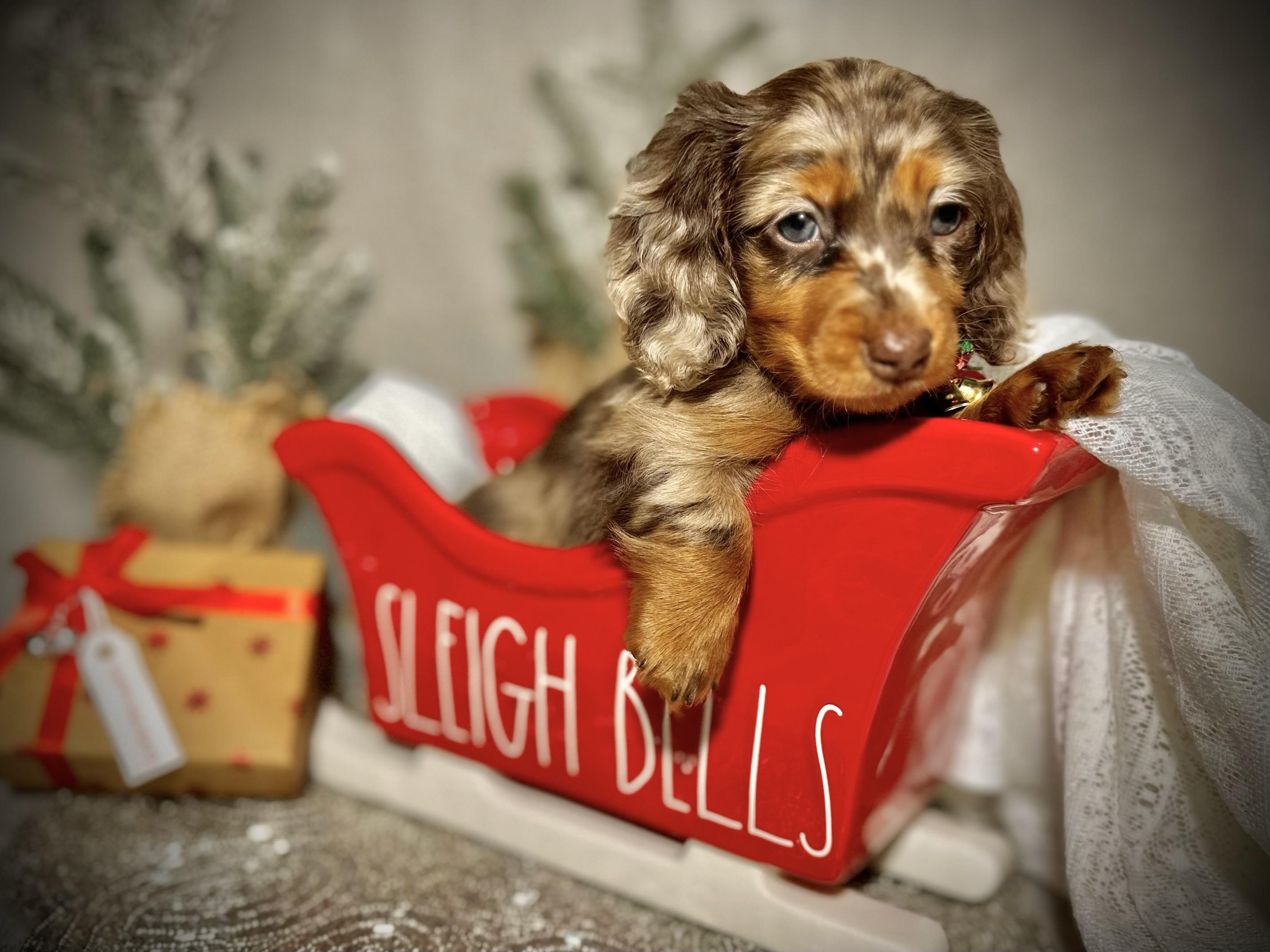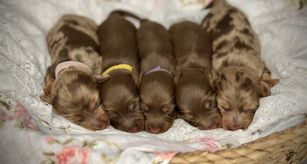 Our puppies include red, chocolate and tan, black and tan, and dapple. Colors will vary depending on the parent dogs.