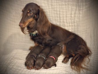 Farah is a female Dachshund over 5 years old. Carefully selected as a great representative of her breed, Jessica decided to make her part of their program. Jessica has passed Good Dog’s screening process, which involved a review of their breeding practices, environment, and the mental and physical health of their dogs.