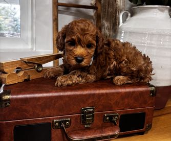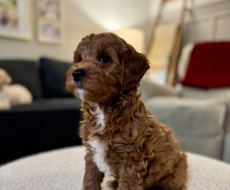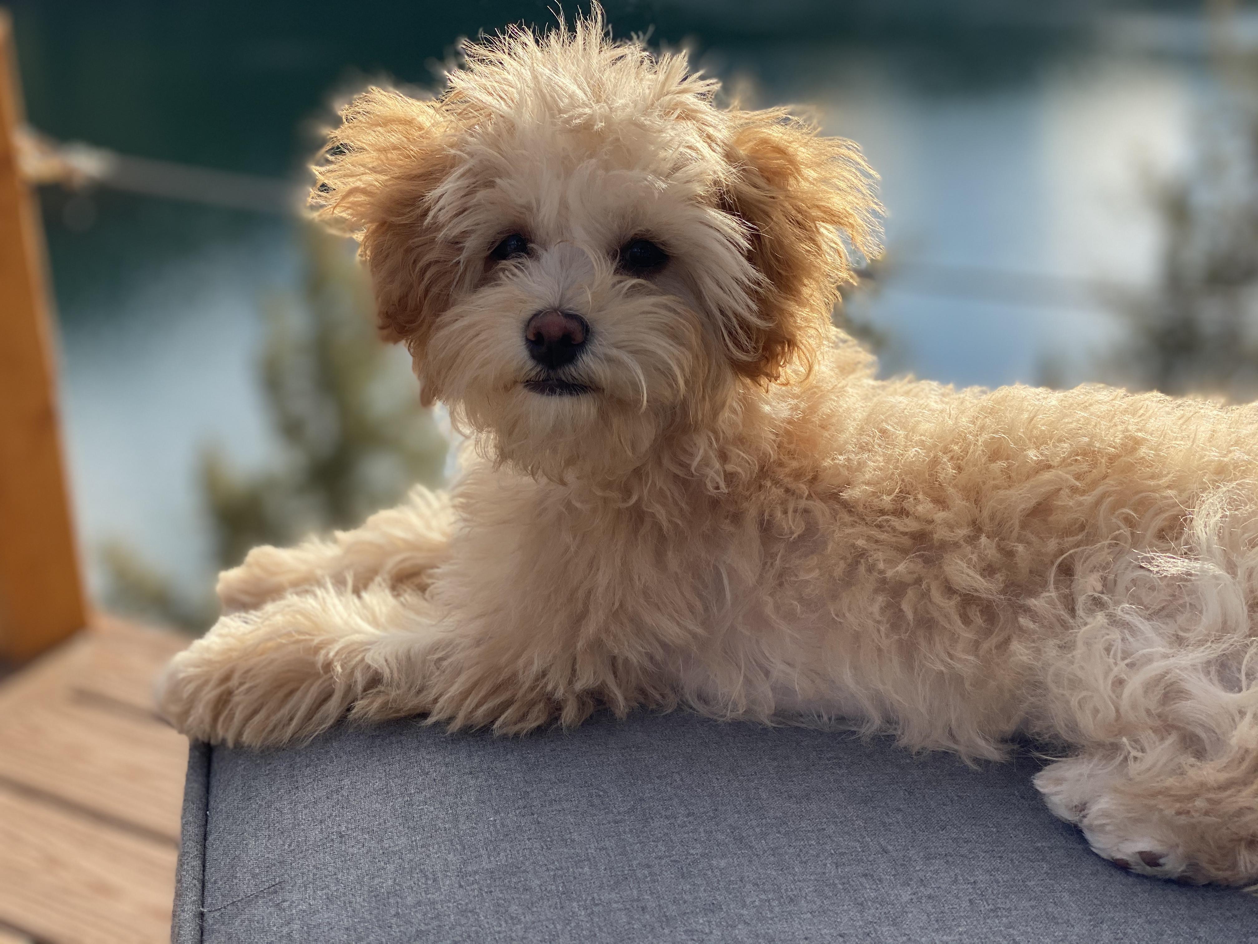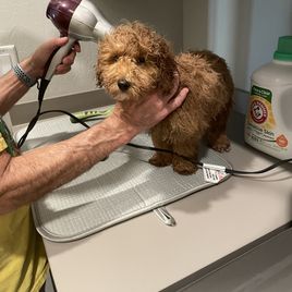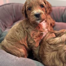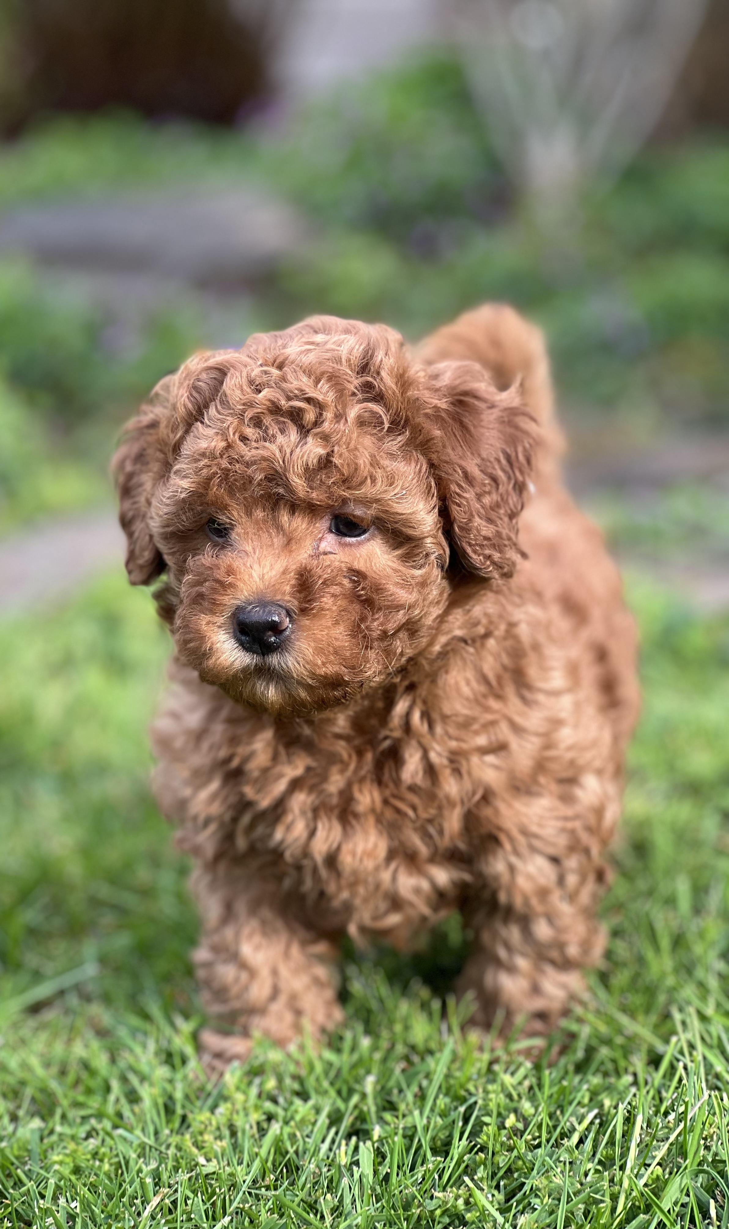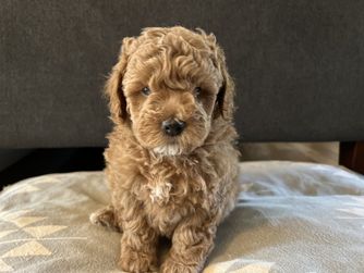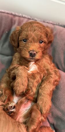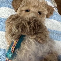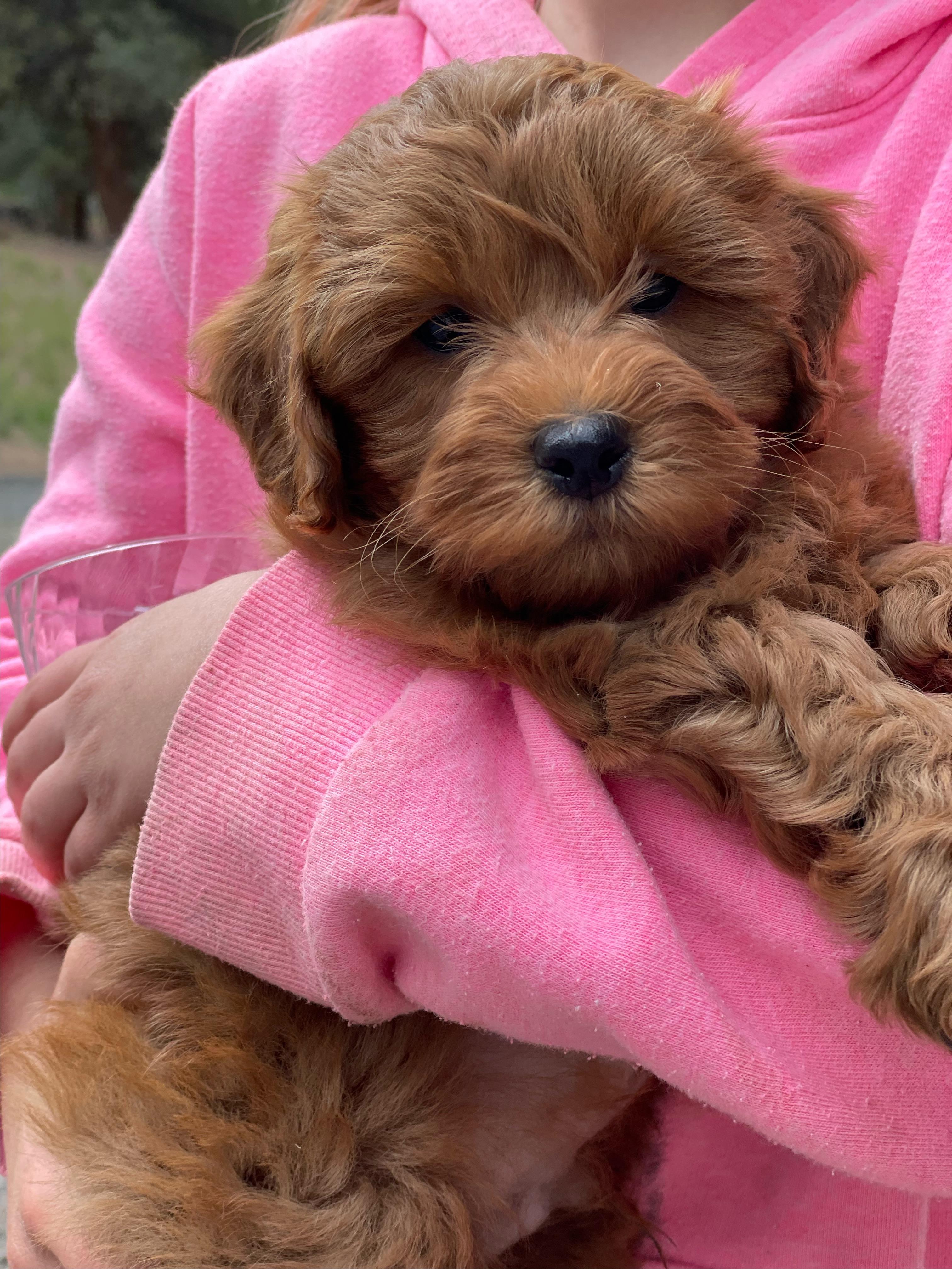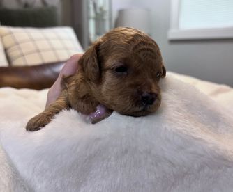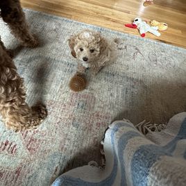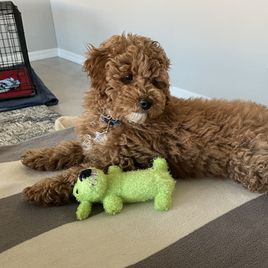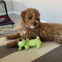 Dolly is a loving micro goldendoodle. She weighs 11.6 #, she has a dark red curly coat. She loves to play fetch and take walks. Dolly loves kids and has a very gentle temperament.