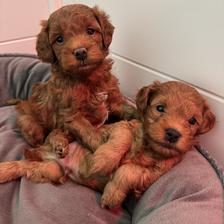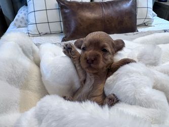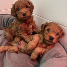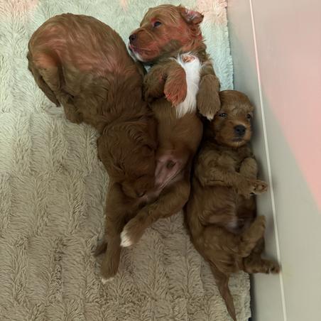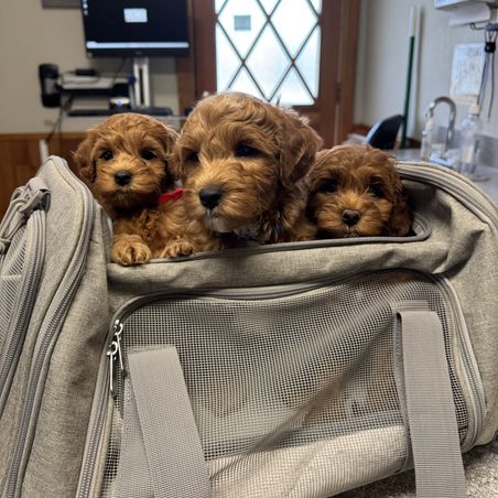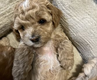 Our Goldendoodle puppies are red. Maltipoo puppies include brown, cream, and red. Colors will vary depending on the parent dogs.