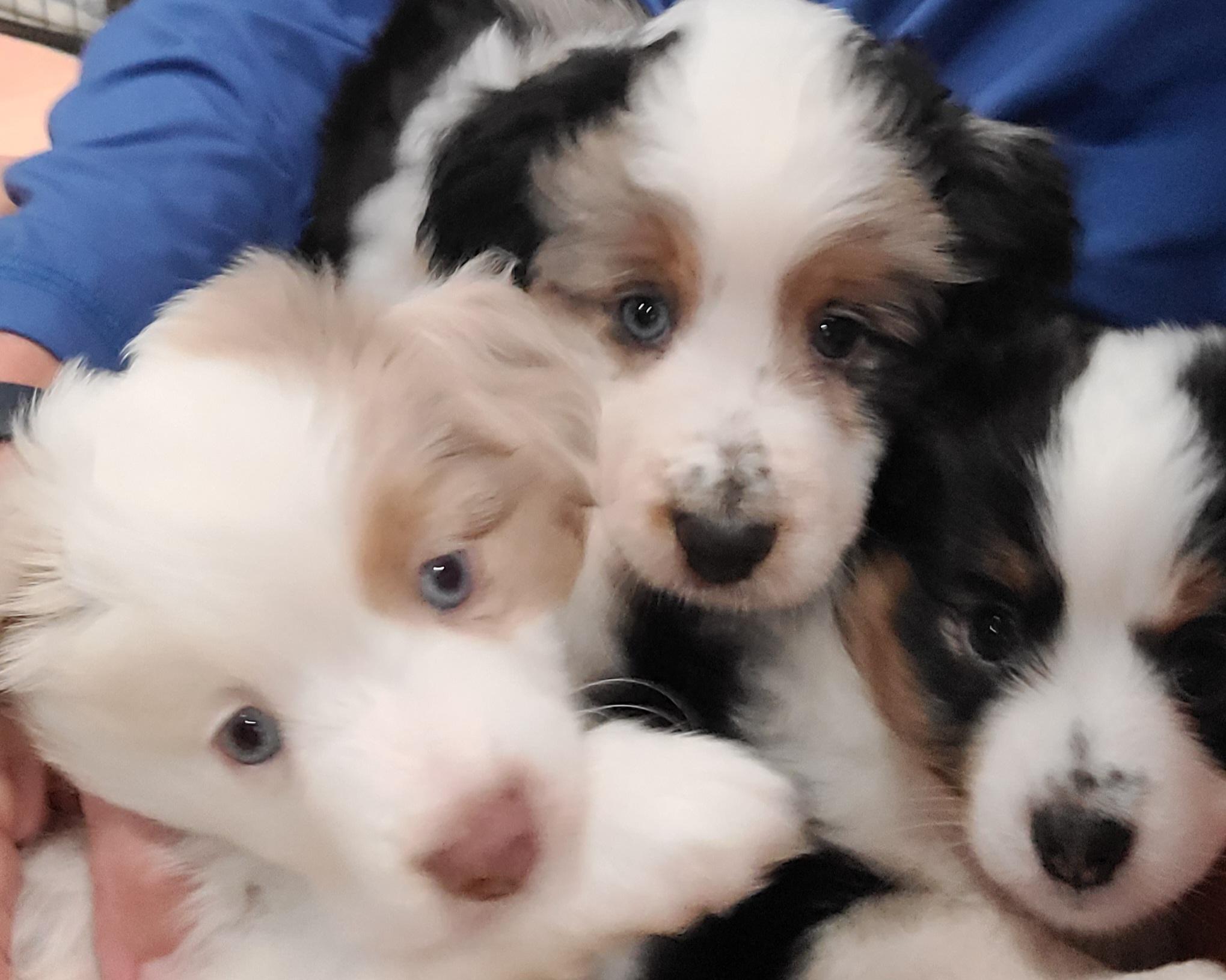 Our Miniature Australian Shepherd puppies include blue merle, black tri, and red merle. Colors will vary depending on the parent dogs.