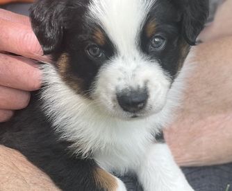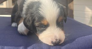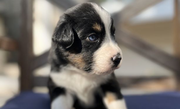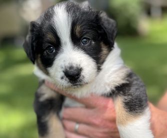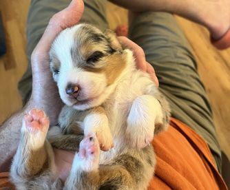 I'm John S., the breeder behind J&J Aussies located in Boulder, CO. On May 18, our beloved Riley gave birth to eight beautiful puppies. Riley is our sweet black-tri Aussie. We brought her into our family with the hopes that she would be an incredible outdoor companion and that one day, our kids could enjoy and witness a dog having puppies. Both hopes came true.
