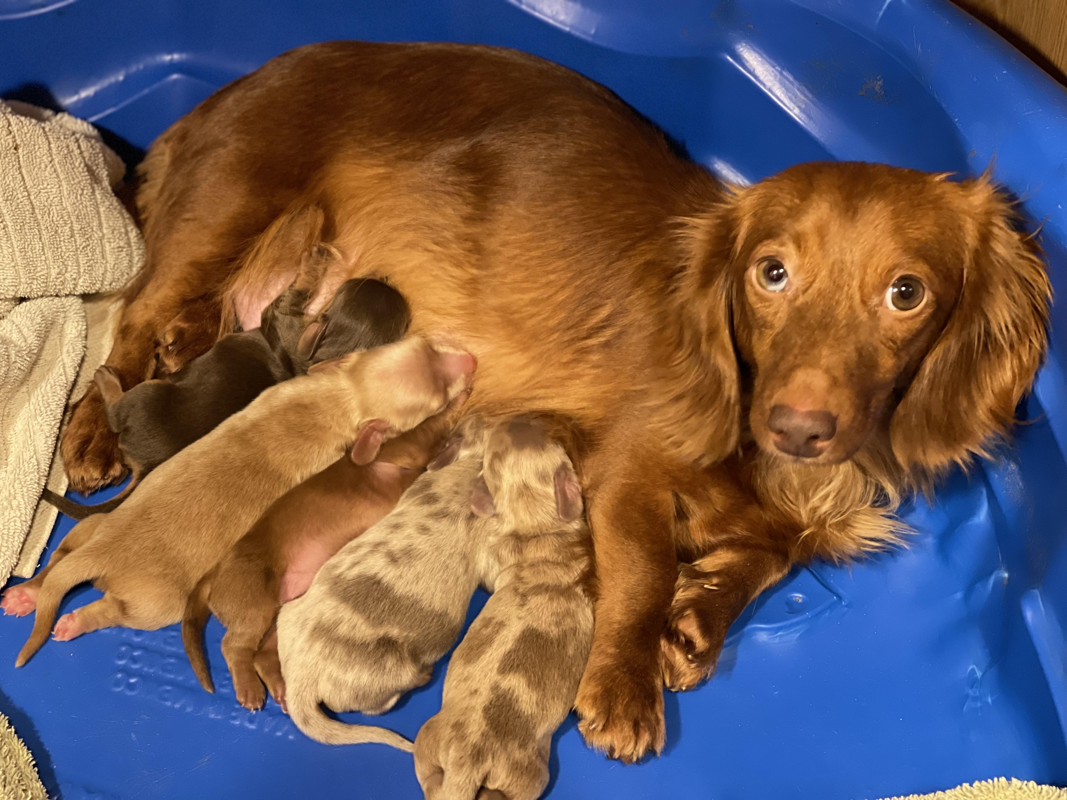 Our puppies include piebald, red, fawn (isabella), fawn (isabella) and cream, chocolate and tan, black and tan, and dapple. Colors will vary depending on the parent dogs.