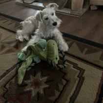 Finley ( Milky Way) is such a great dog. He has mastered sit, come here and no in 1 week. He loves to jump in the new snow, come inside and run around the house, then sleep. He entertains himself for hours. It’s really amazing. We are really lucky to have such a good dog and great dog breeders. Thank you Karrie and Jed- J & K Miniature Schnauzers