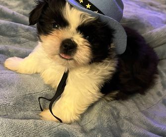 Our Pomeranian puppies are black. Shih Tzu puppies are liver and white. Maltese puppies are white. Colors will vary depending on the parent dogs.