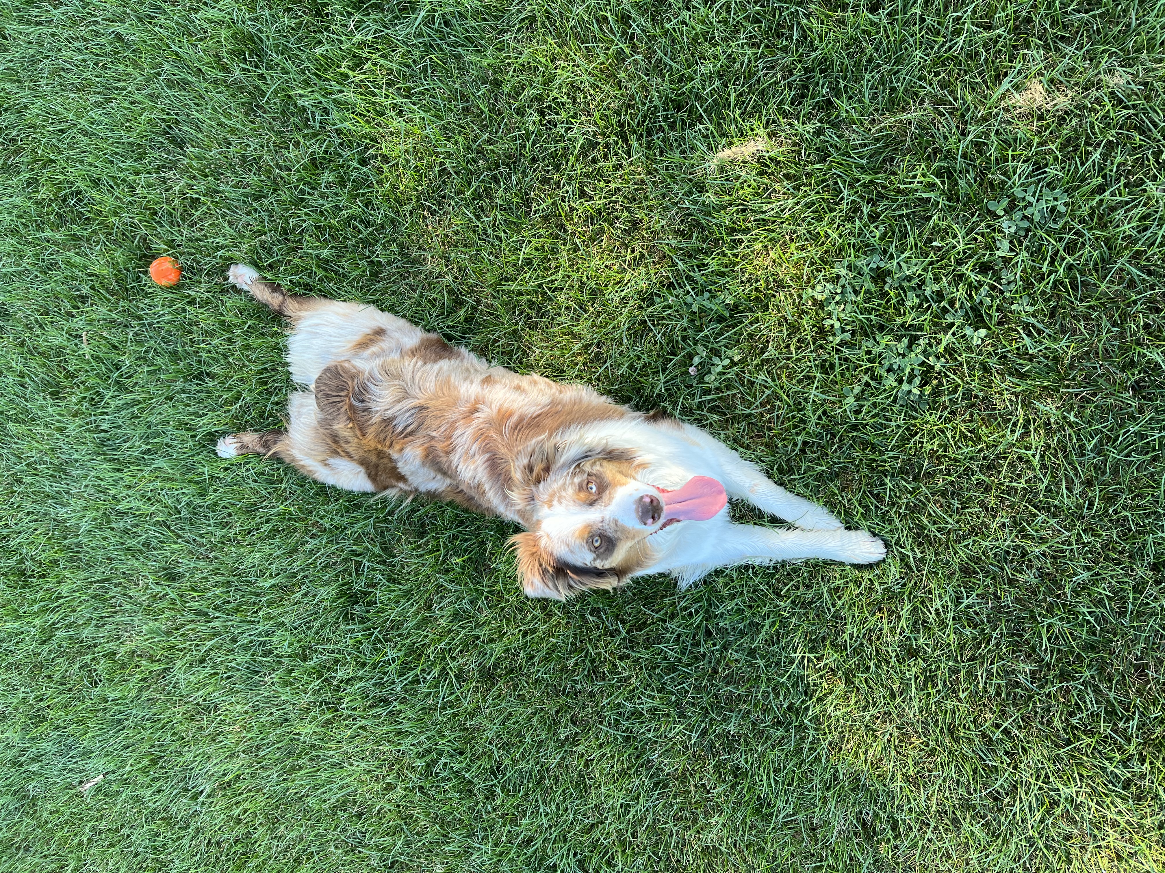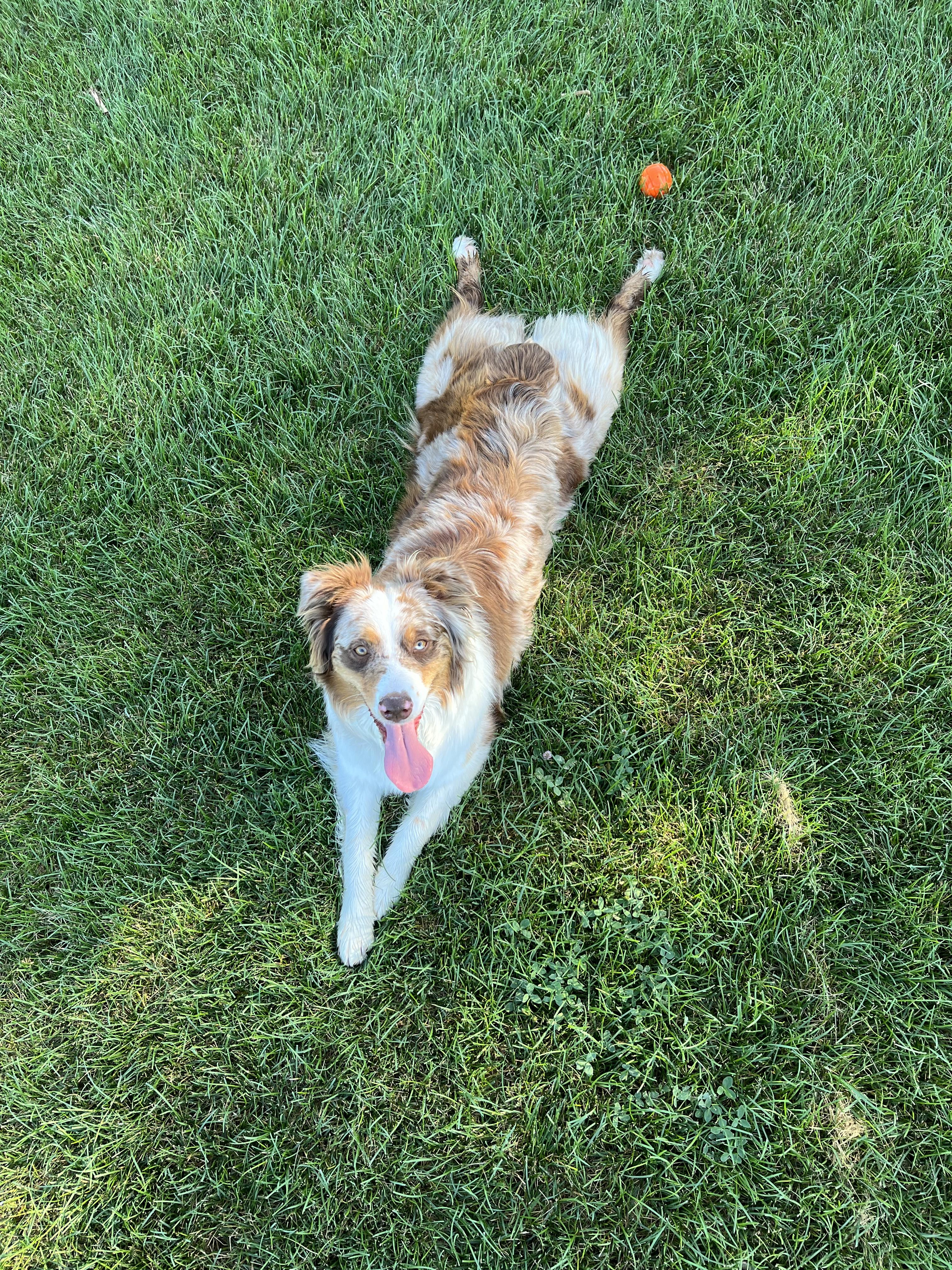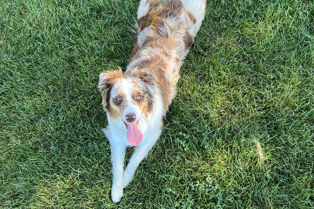 Jojo is a pure bred Australian Shepherd. She is about 52 lbs. Her coat color is red merle. Jojo is snuggly and loves to play fetch, especially with her frisbee. Peanut butter treats are her favorite.