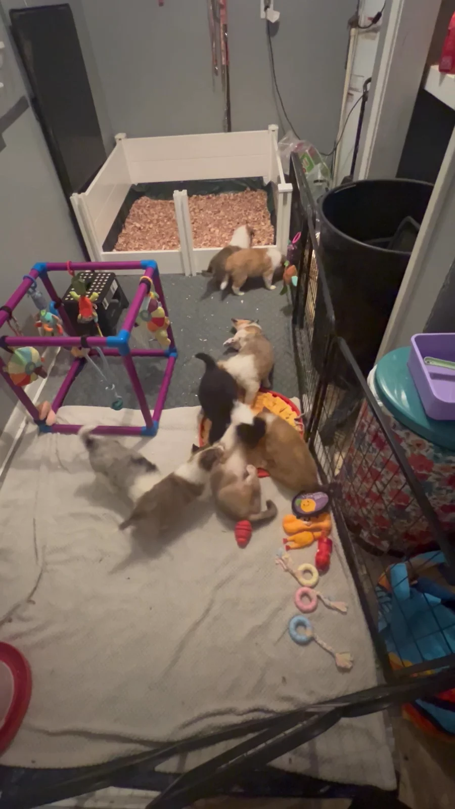 Puppies are growing so fast. They are 3 weeks now and we are in high gear for socializing them to new sounds daily, potty litter box training, puppy food soup, toys, grooming, and lots more.