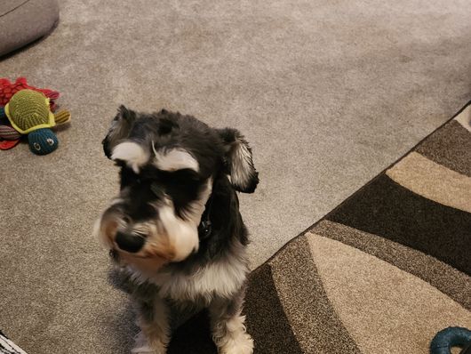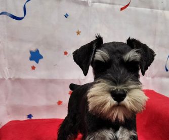 Our puppies include salt and pepper and black and silver. Colors will vary depending on the parent dogs.