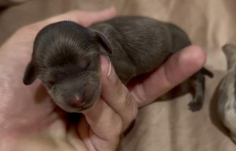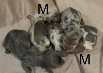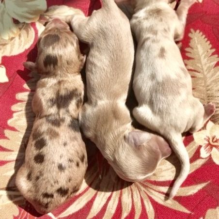Our puppies include piebald, cream, fawn (isabella) and cream, chocolate and cream, blue and cream, black and cream, and dapple. Colors will vary depending on the parent dogs.
