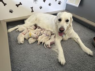 I got into breeding after being a guardian for another breeder. I grew up with big dogs and once we received our first Golden... I knew my life had changed forever. I couldn't get over the temperament of our sweet Estee. My breeder friend then helped me get started and taught me all the important aspects of being a responsible breeder. This has changed our lives in such a positive way... we absolutely love what we do. I have the best job, and I'm so happy I get to bring such "joy" to another family and dog when we make the perfect match.