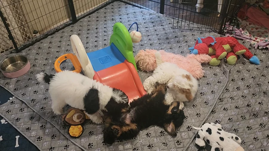 “Puppies will be vet checked and age appropriate shots done. Will be dewormed as directed by my vet. Will be michrochipped. Each puppy will go home with puppy food,stuffie toy and blankie. Also with a folder with a health guarantee and vet papers. I understand life gives us curveball when your planning for your new fur baby so if this happens I am willing to move your deposit or in some cases send back. Please just talk to me so we can decide on the right way to handle it. I will make the final decision in this.”