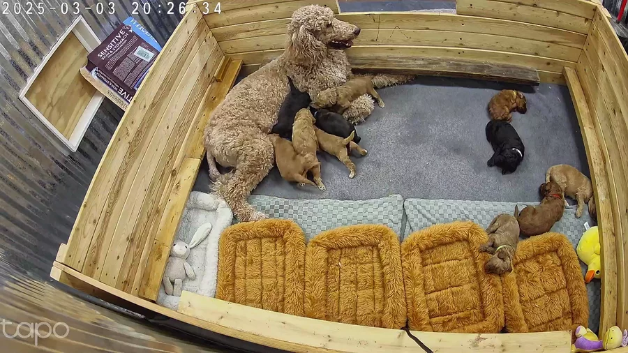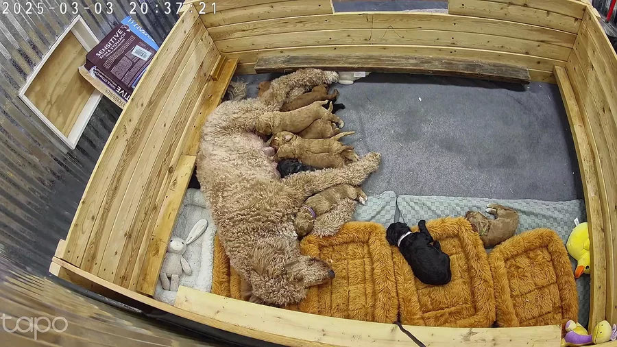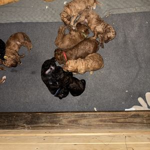 She has had two large litters (12 & 13) and was a great mom. The girls have been high energy, happy and loving. The boys have been a little calmer but also happy and loving puppies.