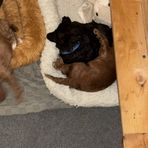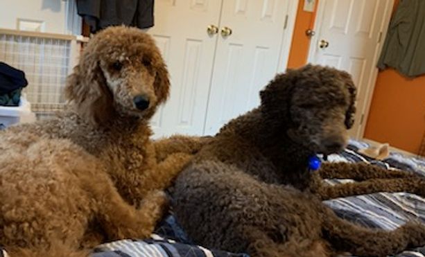 We both have always loved animals and have had cats and dogs throughout our lives. Always had cats, started adopting greyhounds then fell in love with Aussies. When the kids got older, it became too difficult to clean up after the kids and all the dog hair. After a 13-year break, fell in love with poodles' personalities and them shedding no hair.