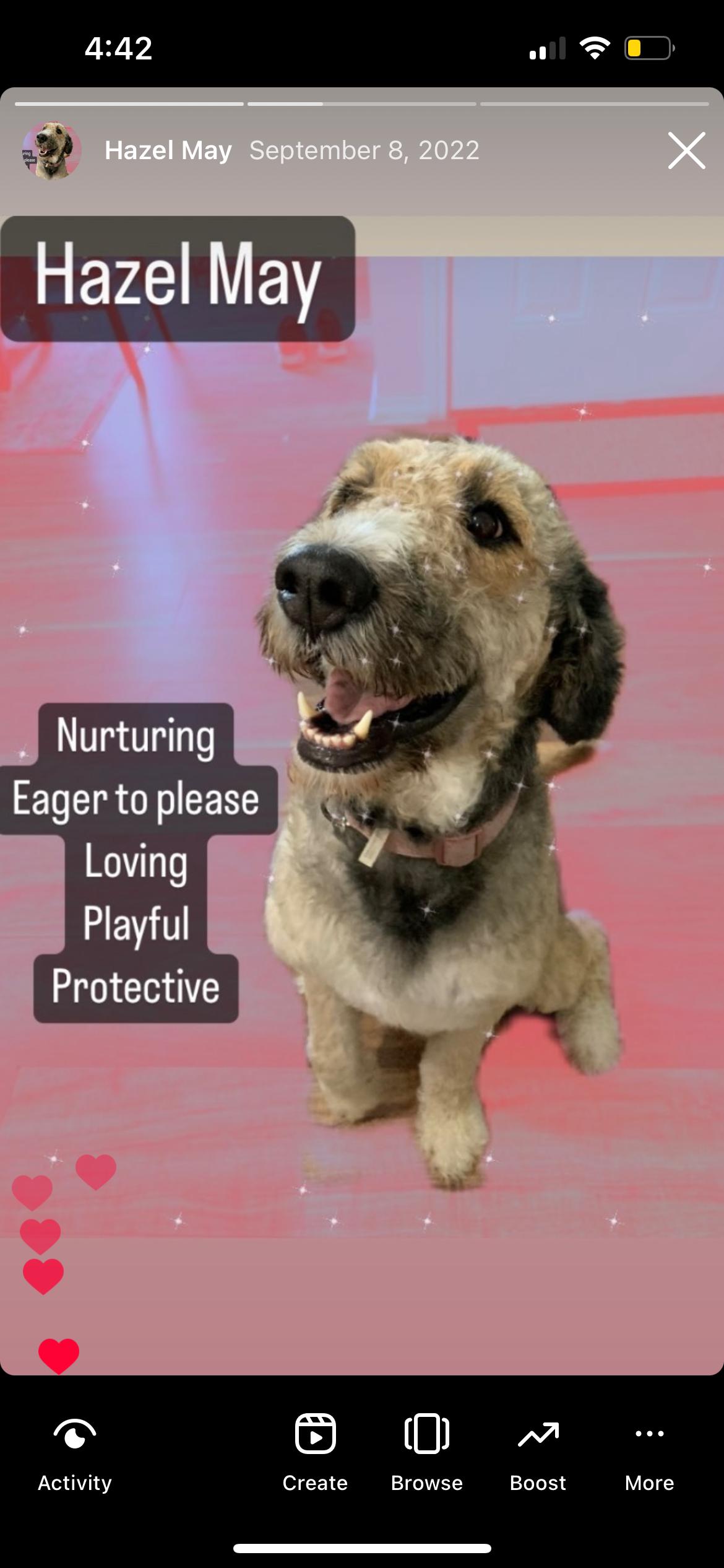If you have the chance to get a puppy from Joy - GET A PUPPY FROM JOY. Not only was she extremely responsive, she got on a FaceTime with us to show us our gorgeous girl and tell us everything we needed to know. She followed up with updates, pictures, and videos in the week before we could go get her. Joy is kind responsive and so incredibly transparent and GOOD. As far as our puppy goes - she’s perfect. You can tell she was loved for every moment Joy had her. She’s a calm and incredibly even keeled pup. Multiple trainers have told us how rare it is to have a puppy that is so aware, intelligent, and calm. She’s also gorgeous. People run off their porches to ask us what breed she is and who we got her from. People change their paths so they can say hi to our girl screaming “OH MY GOSH SHE’S SO CUTE”. Over and over we give so much of the credit to Joy for her incredible breeding. From appearance, to temperament, loving personality, and trainability - she’s perfect and our home is all the better and happier for it.