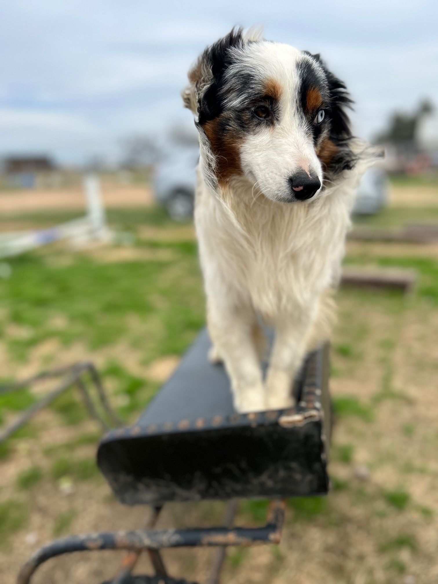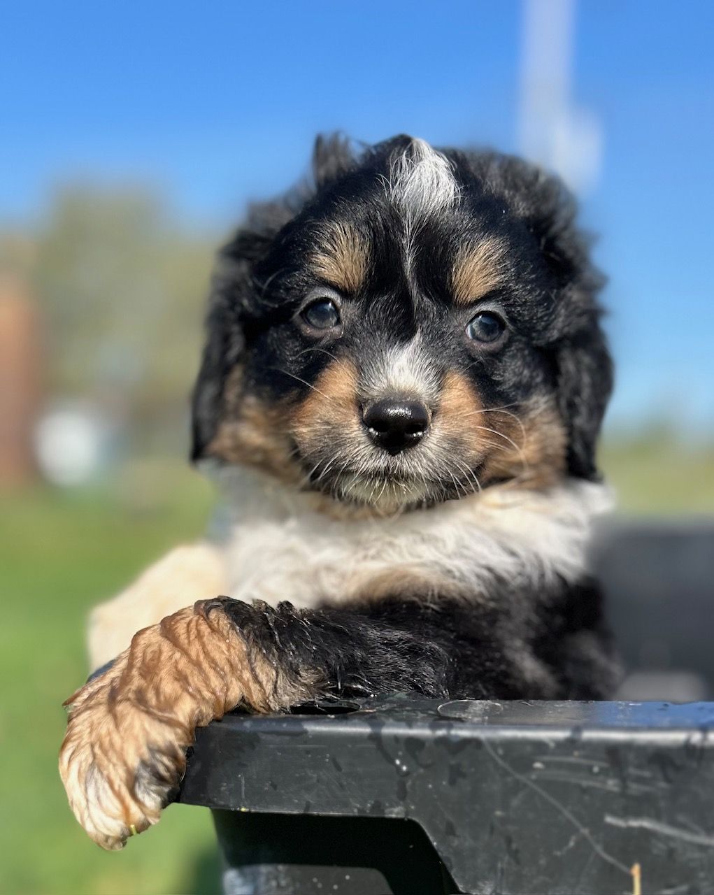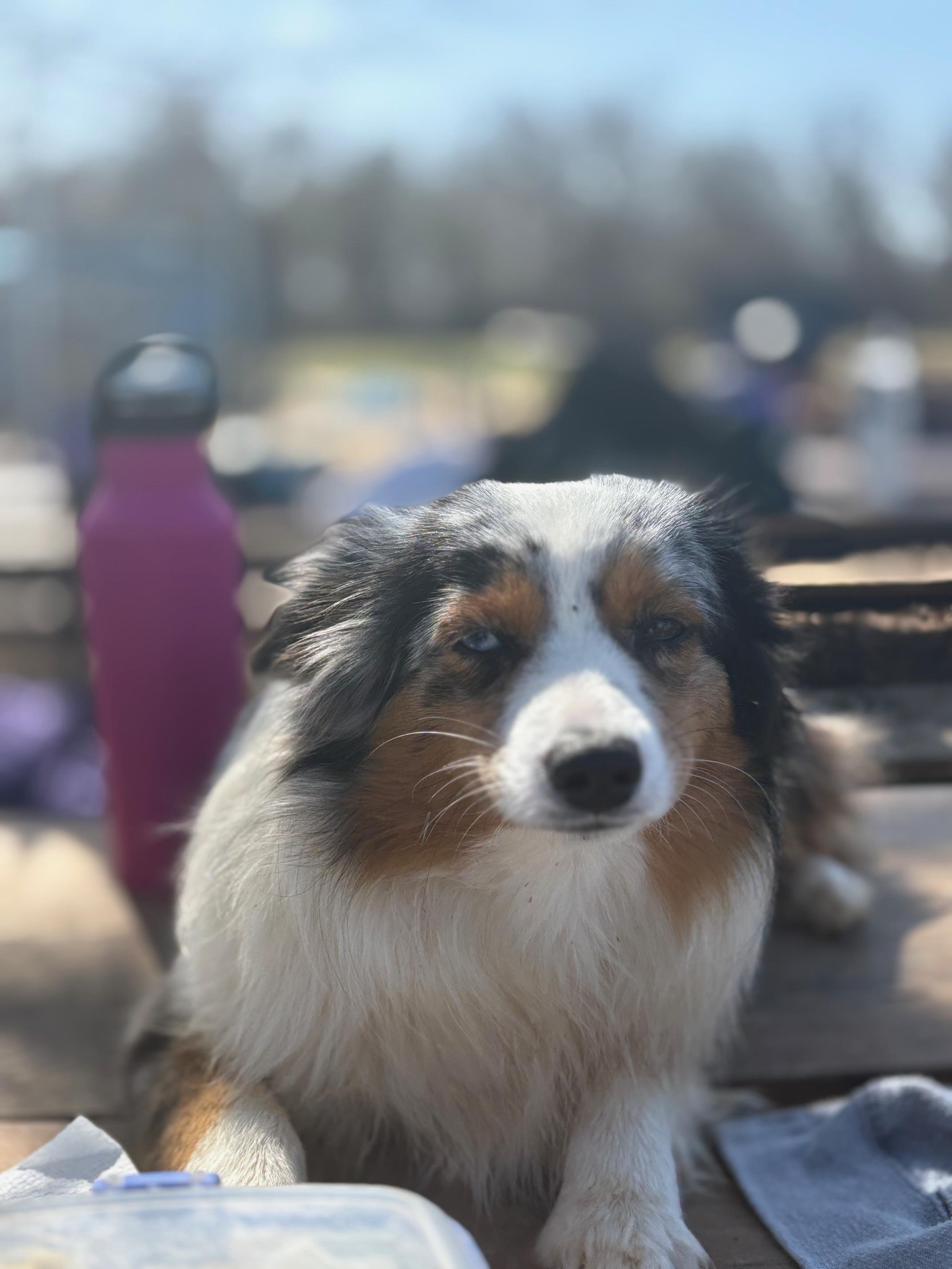 Very sweet natured with lots of energy and eager to please. Smaller mini size. One blue eye, one brown eye. Beautiful blue merle markings and sweet face. She is vibrant, loves to run, but also appreciates her snuggles! Great with the kids and loves all people! She's also been a great mom!