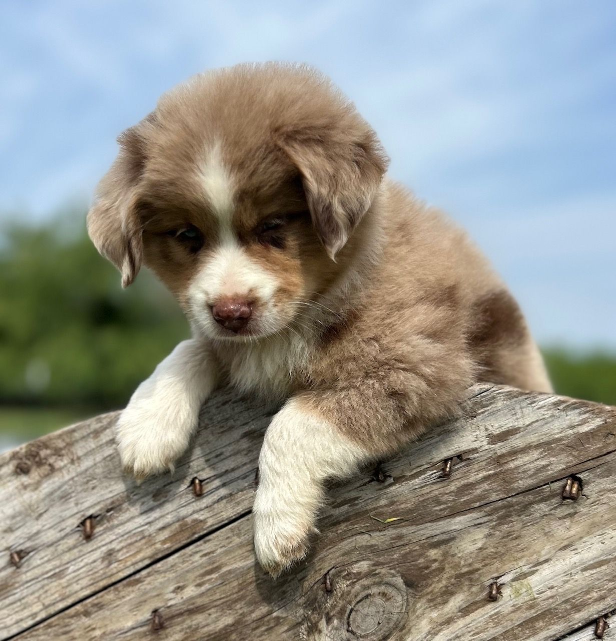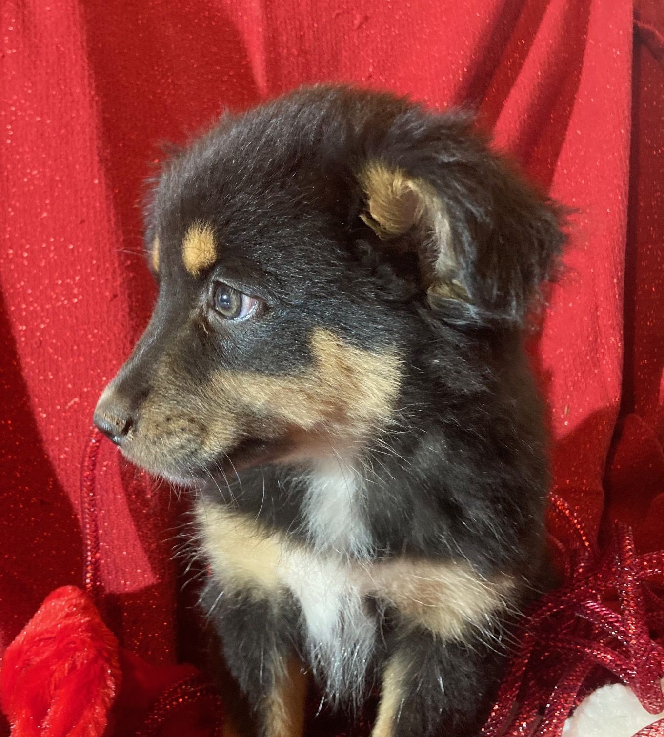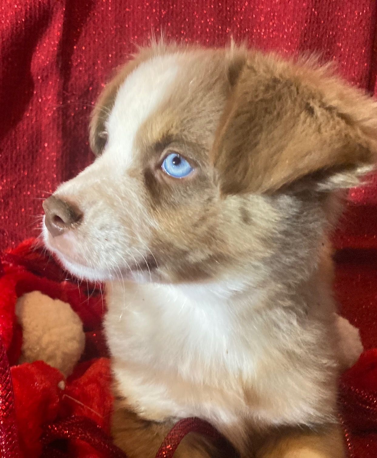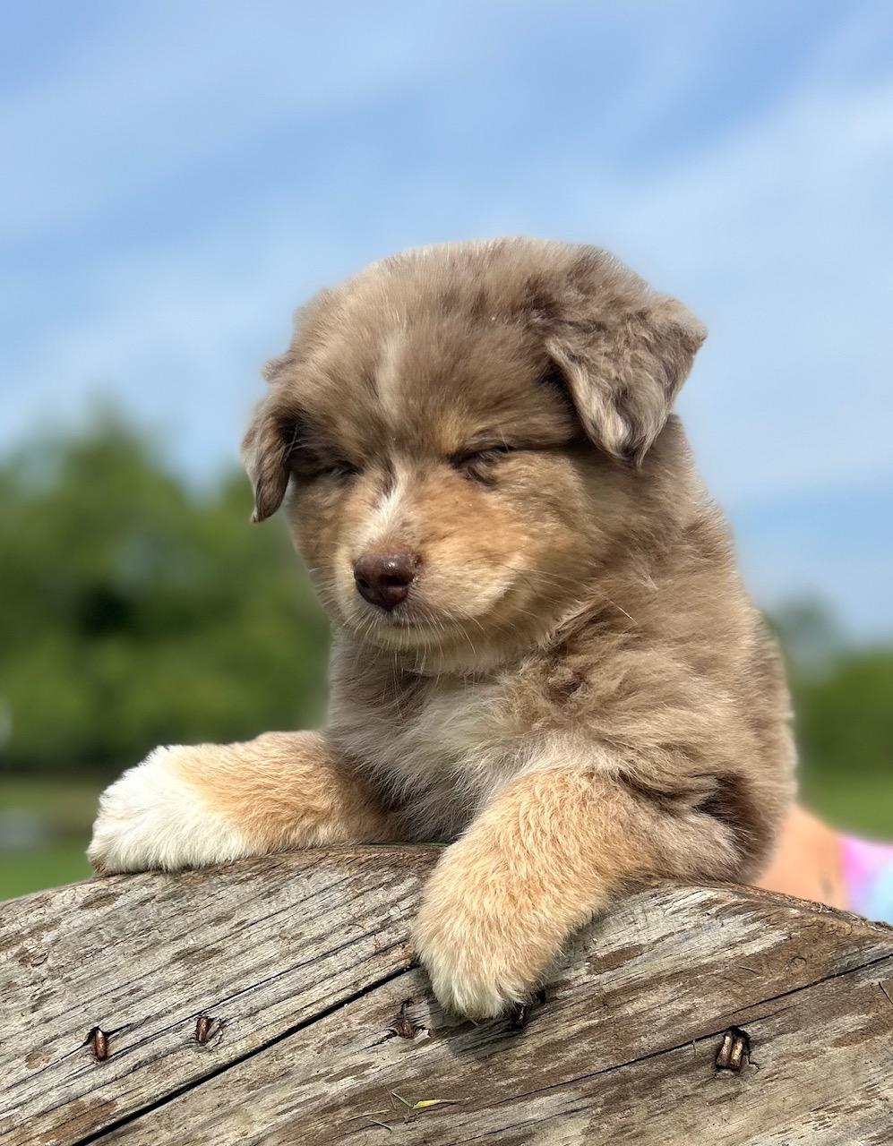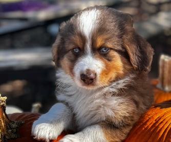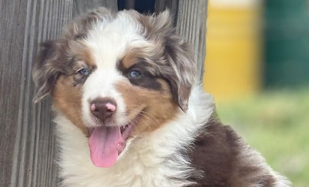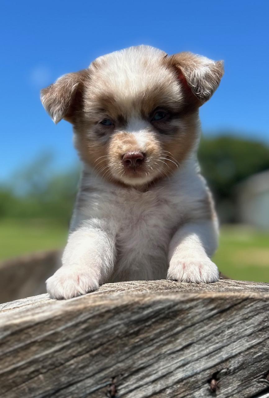 Red tri with brown eyes. Larger mini size. Jude loves to play and snuggle, and follows commands with ease. He adores all people!