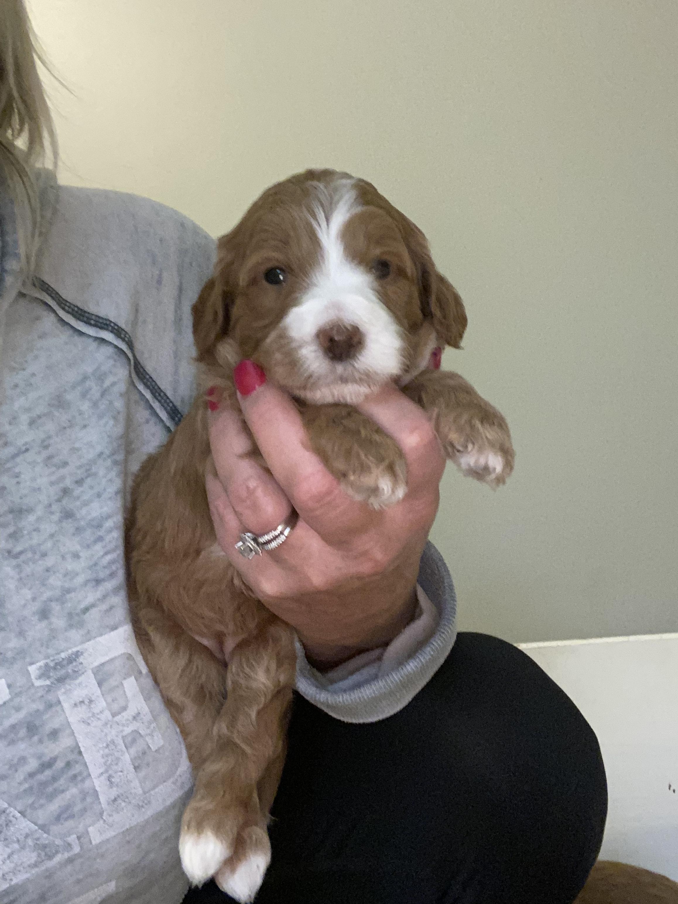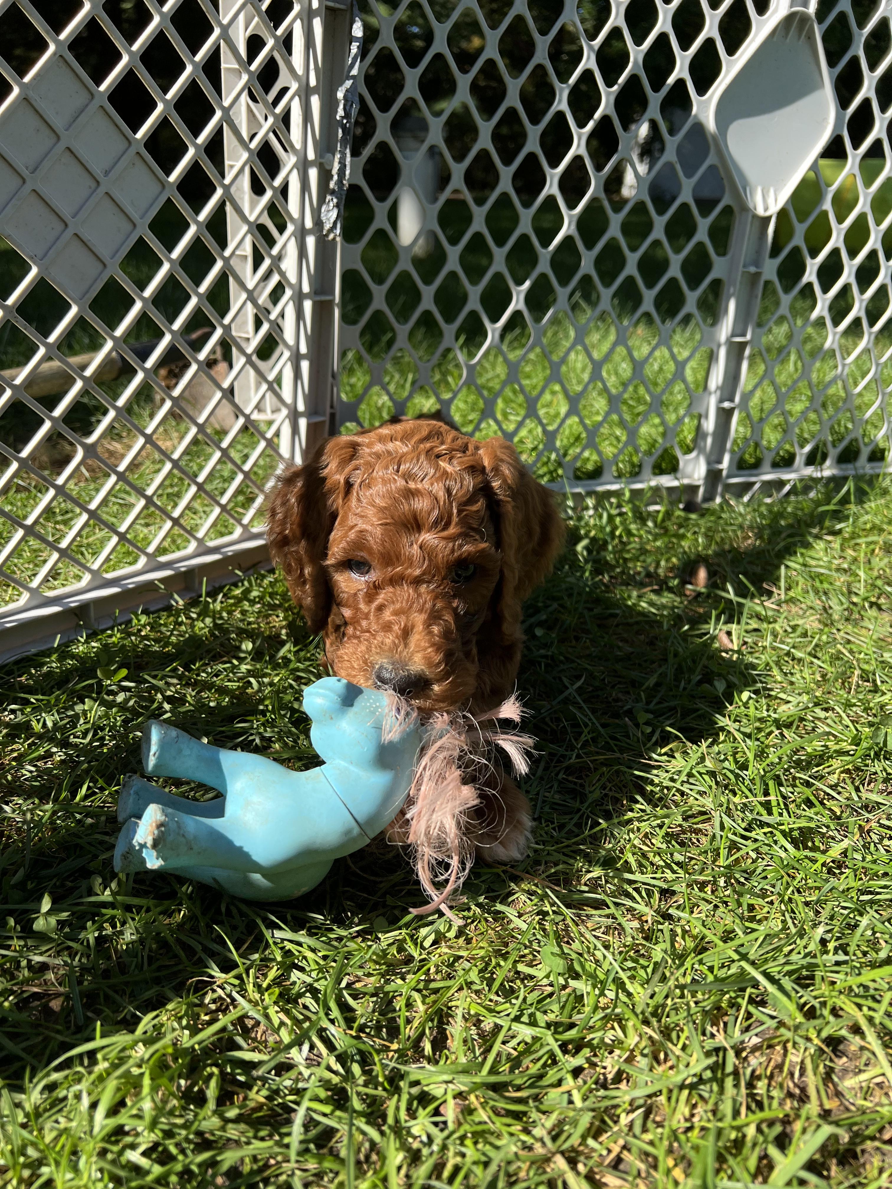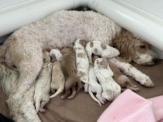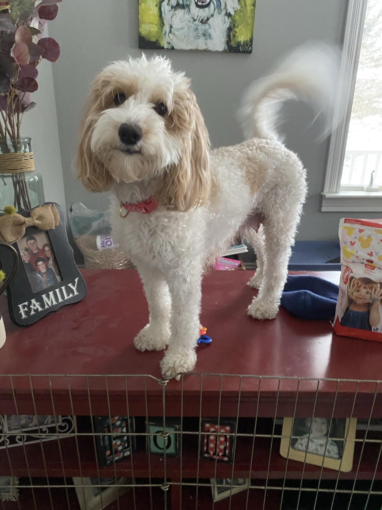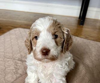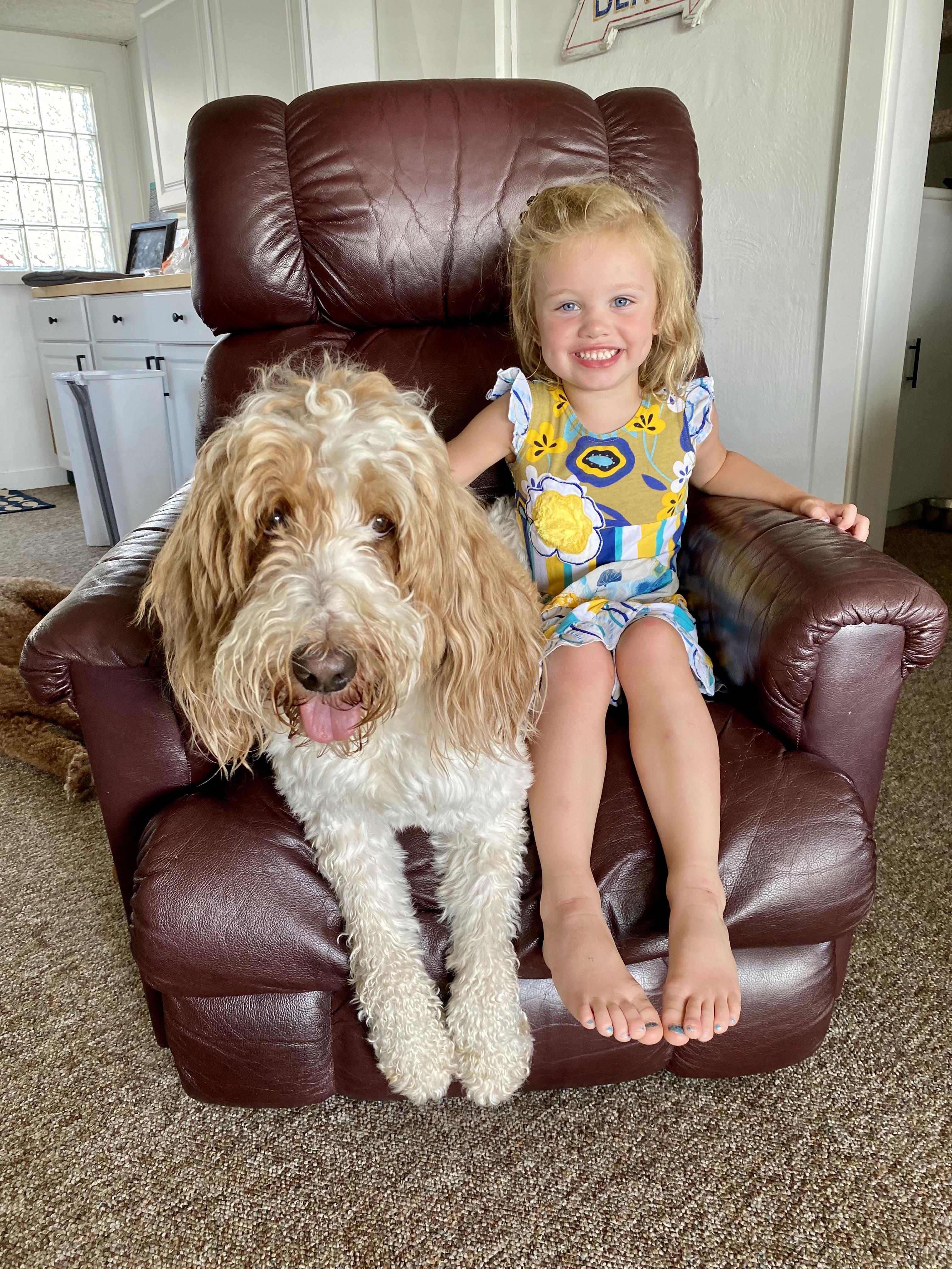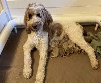 Beatrice is our beautiful 38# parti colored F1b Goldendoodle. She has a sweet loyal calm personality. She loves to cuddle and will chase a tennis ball 300 times if you’ll continue to throw it. But, if you decide to stop she will lay calmly at your feet with the ball without barking without whining and wait patiently for you to change your mind. she loves kids and babies and other dogs. She is a wonderful loving mama.