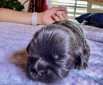 Meet Nosha, a gorgeous AKC-registered chocolate liver girl with a silky, chocolate brown coat. Her gentle, affectionate nature makes her a true companion, always close by, offering soft snuggles and quiet, loving company. Nosha’s calm and sweet personality brings warmth and happiness to every moment.
