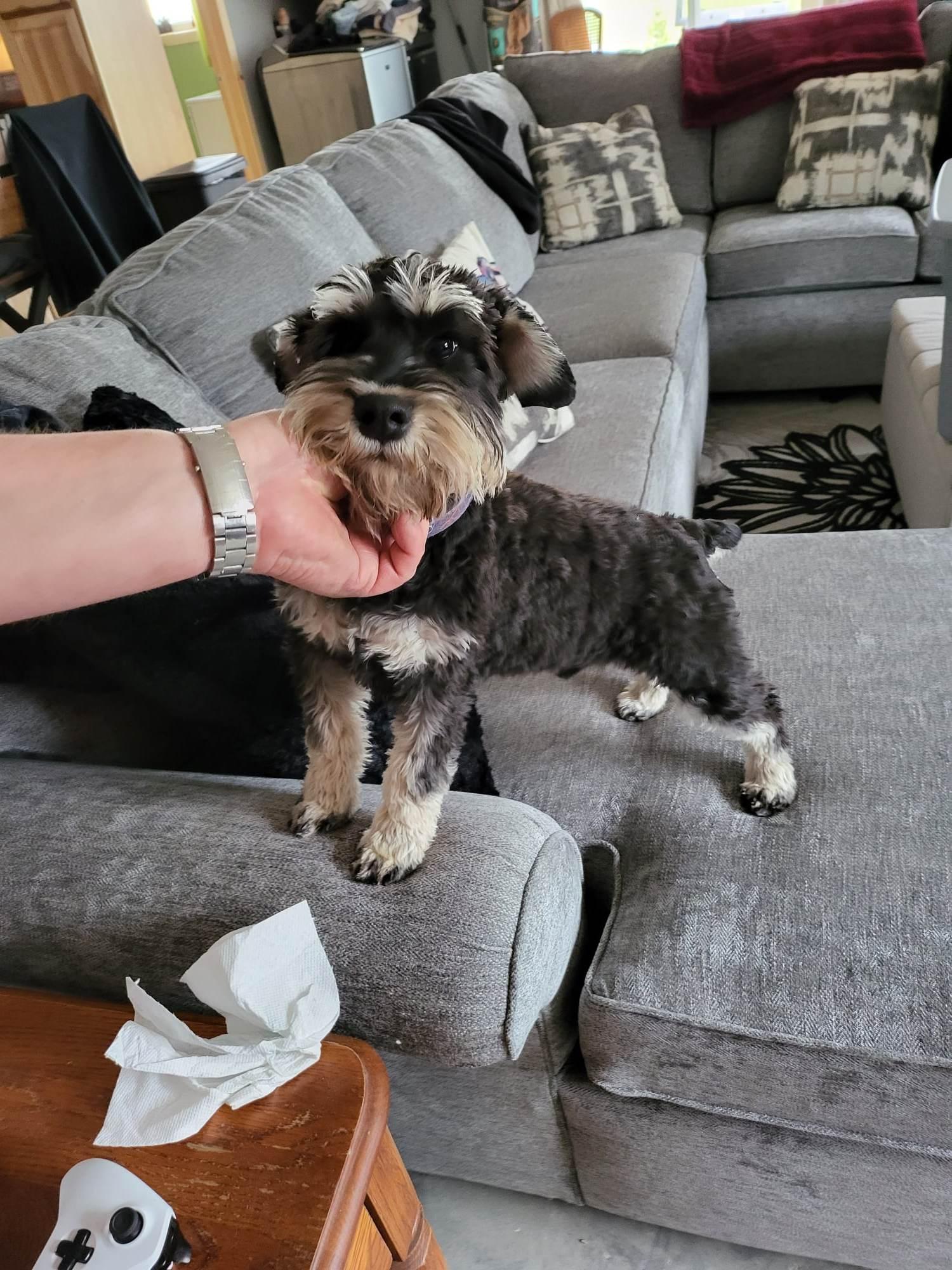 Frankie is a male Miniature Schnauzer. Carefully selected as a great representative of his breed, Julie decided to make him part of their program. Julie has passed Good Dog’s screening process, which involved a review of their breeding practices, environment, and the mental and physical health of their dogs.