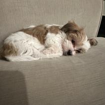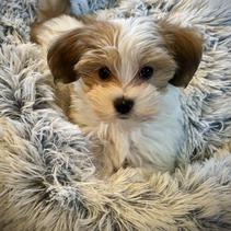 Rissa is a sweet and pampered red Havanese with white socks who loves attention and affection. After a good grooming session, she thrives on praise and enjoys the extra love she gets. While she may need a little encouragement to go on walks, she’s always ready for fun when it’s time to play. She let's her cute inner monster out when engaging in rough-and-tumble play with Amos, her favorite playmate. Before bed, she demands cuddles, ensuring she gets her fair share of love. Rissa is also protective of her family, and her intelligence shines through especially when keeping a watchful eye over her home. She's always the first to notice when something is out of place. With her soft coat and the sweetest kisses, she knows how to melt hearts.
