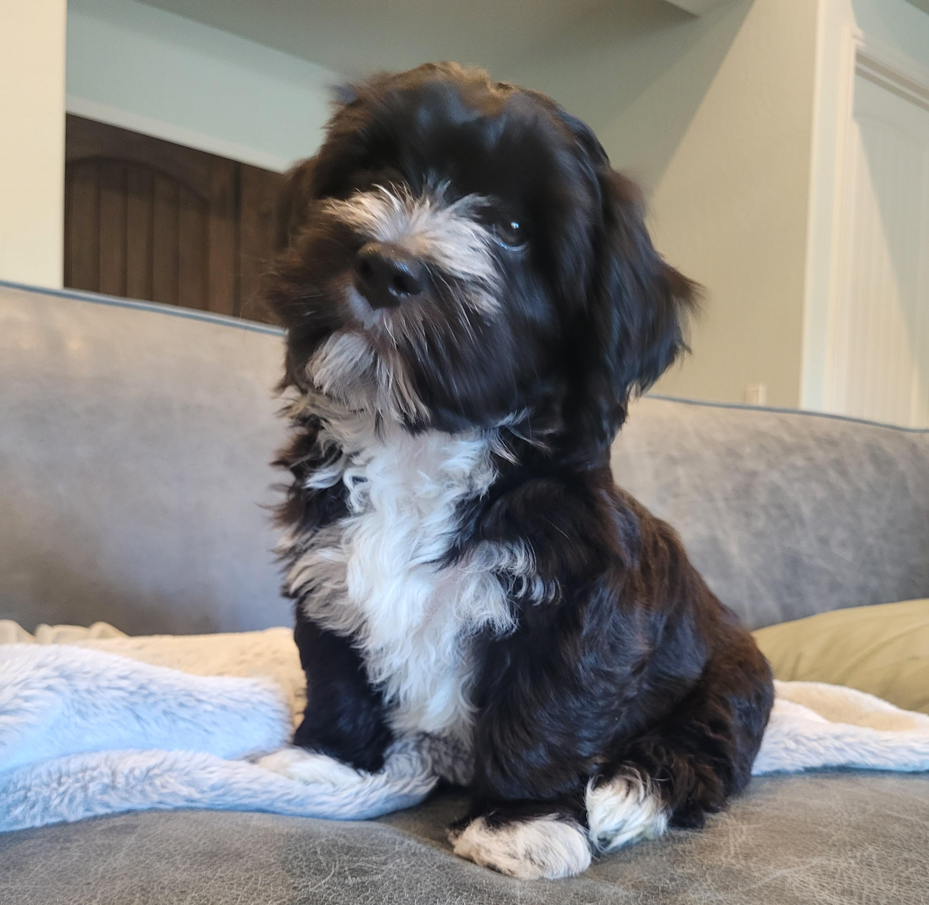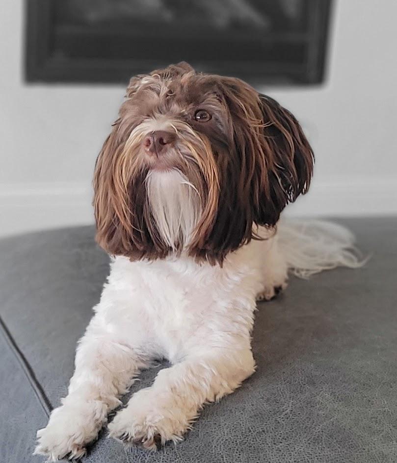 Amos is a chocolate color Havanese with white parti-colored markings. He has a wonderfully sweet and affectionate personality. He’s playful and energetic, often engaging in fun games with his toys and chasing around with his mate, Rissa. When he's not active, he’s content to relax and snuggle at our side, showing his loving and loyal nature. He has a combination of playfulness and calm affection which makes him an ideal companion. He is always ready for a game or a cozy cuddle session.