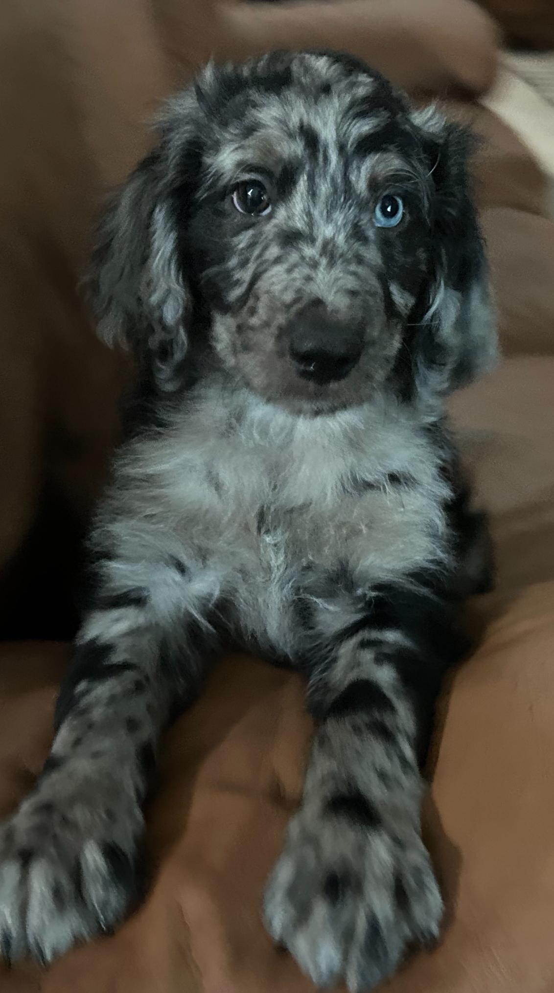 Aussiedoodle puppies include blue merle and black and white. Colors will vary depending on the parent dogs.