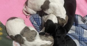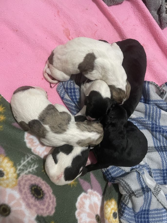 Our puppies include red brindle and white, white and red, fawn and white, white and fawn, white and black, red and white, and black and white. Colors will vary depending on the parent dogs.