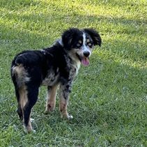Chance is such a sweetheart. He stands 15.5 inches tall and weighs about 23 pounds. He is a blue merle with no copper markings and 2 blue eyes. He is clear for a complete Aussie genetic panel.