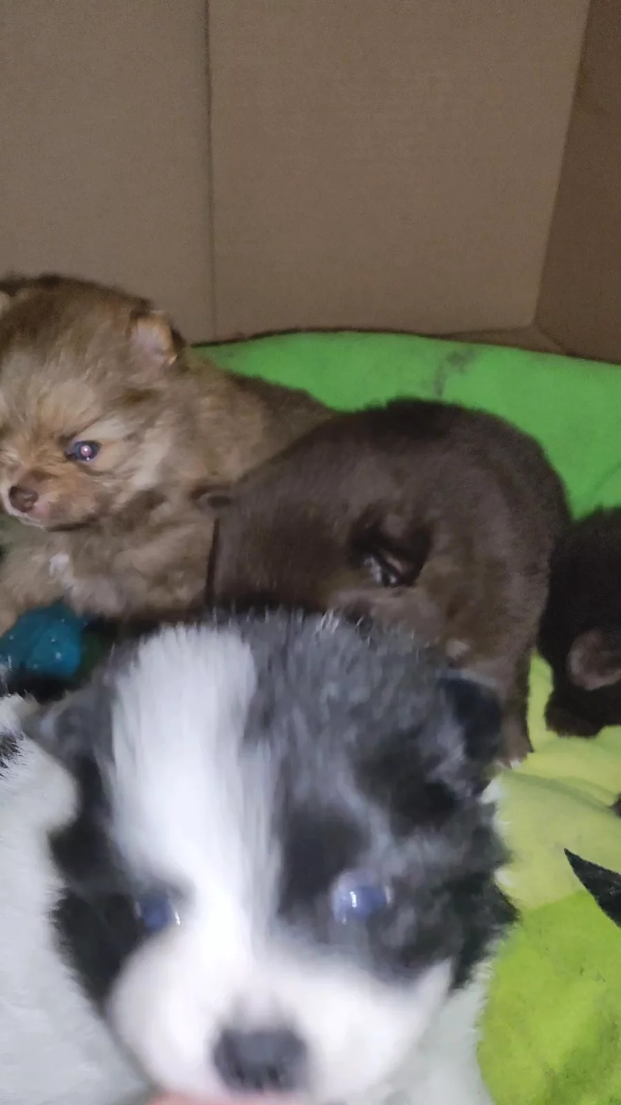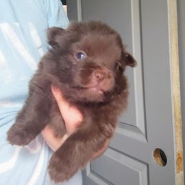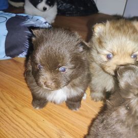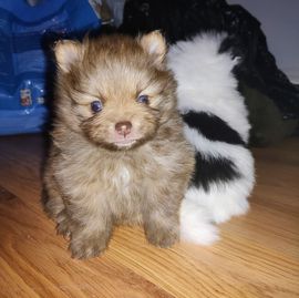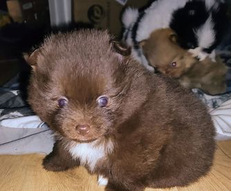 Our Pomeranian puppies include chocolate and black and tan. Shetland Sheepdog puppies include black and white, sable and white, black white and tan, sable merle and white, and blue merle and white. Colors will vary depending on the parent dogs.