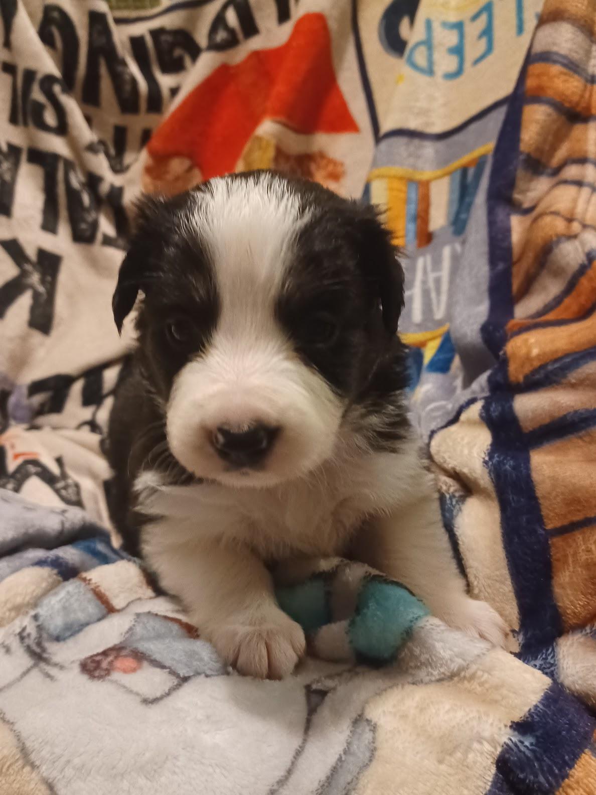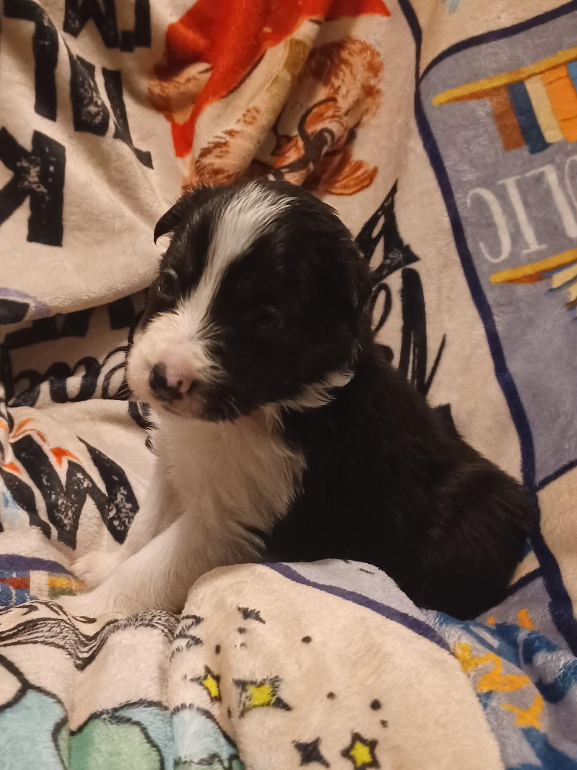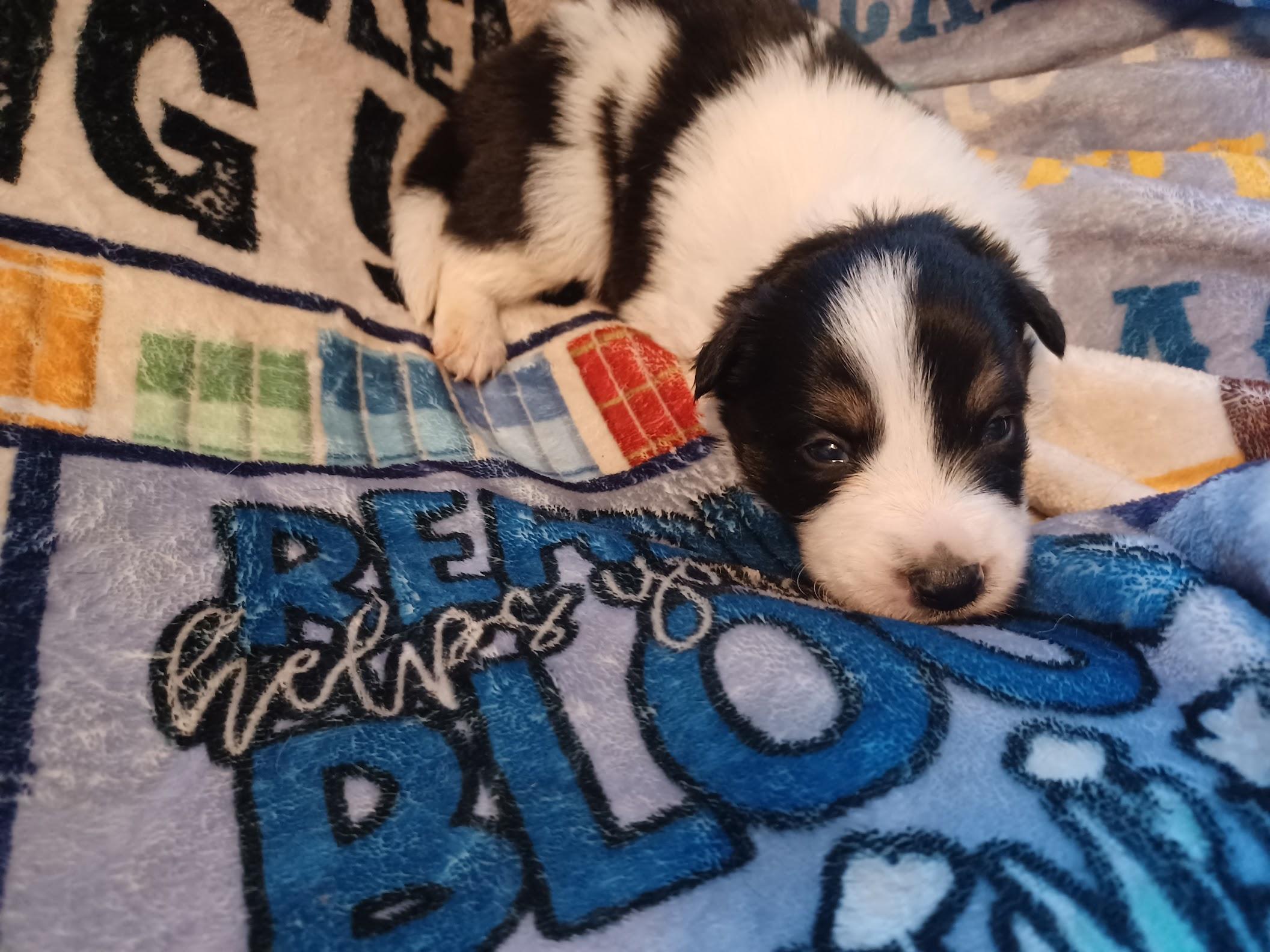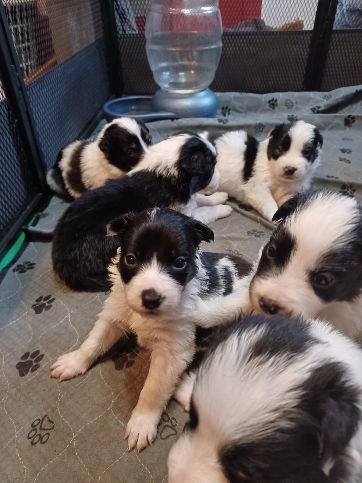 Our puppies include tri-color, black and white, and blue merle. Colors will vary depending on the parent dogs.