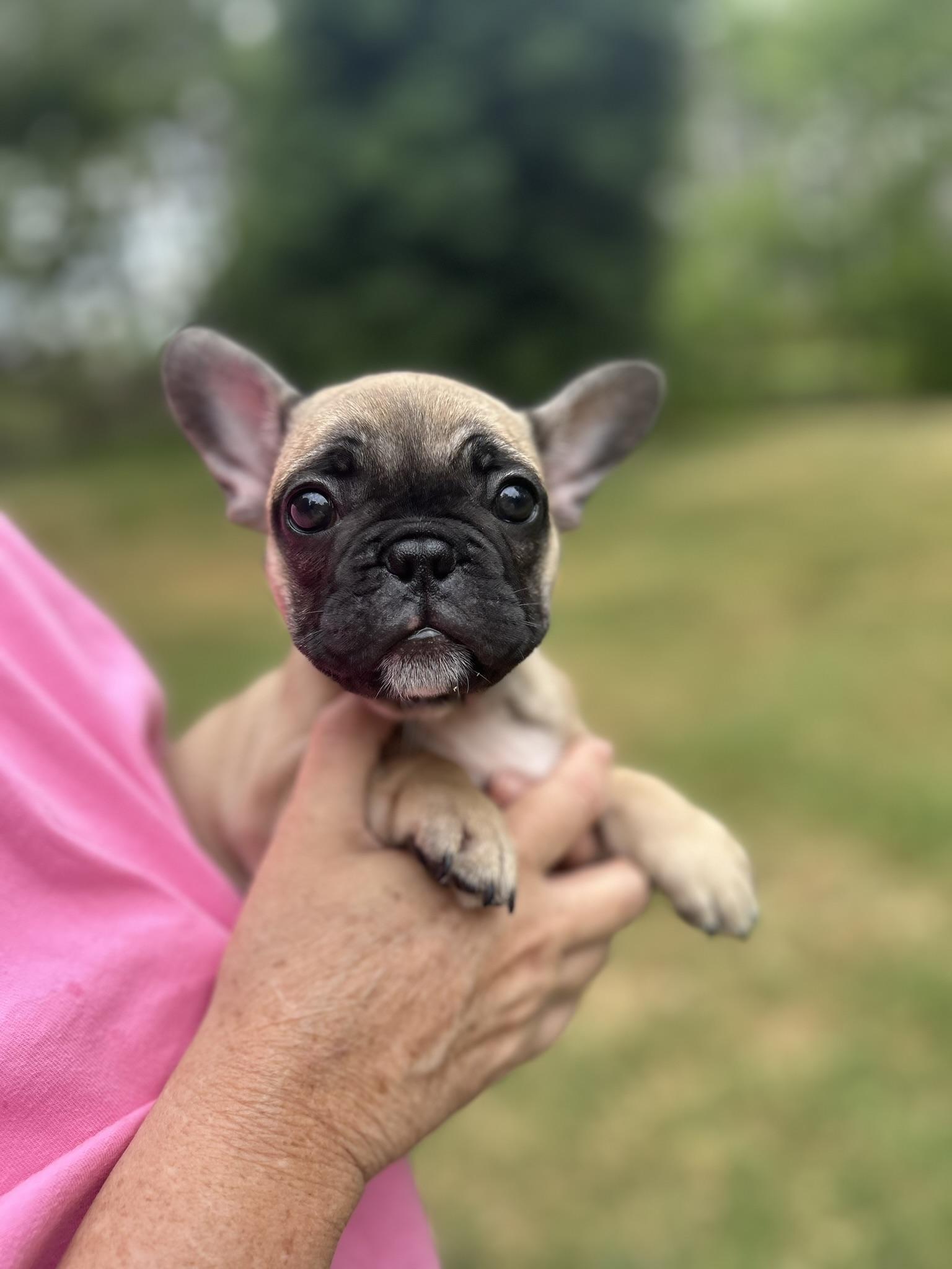 Our French Bulldog puppies include brindle, fawn, and brindle and white. Black and Tan Coonhound puppies are black and tan. Colors will vary depending on the parent dogs.
