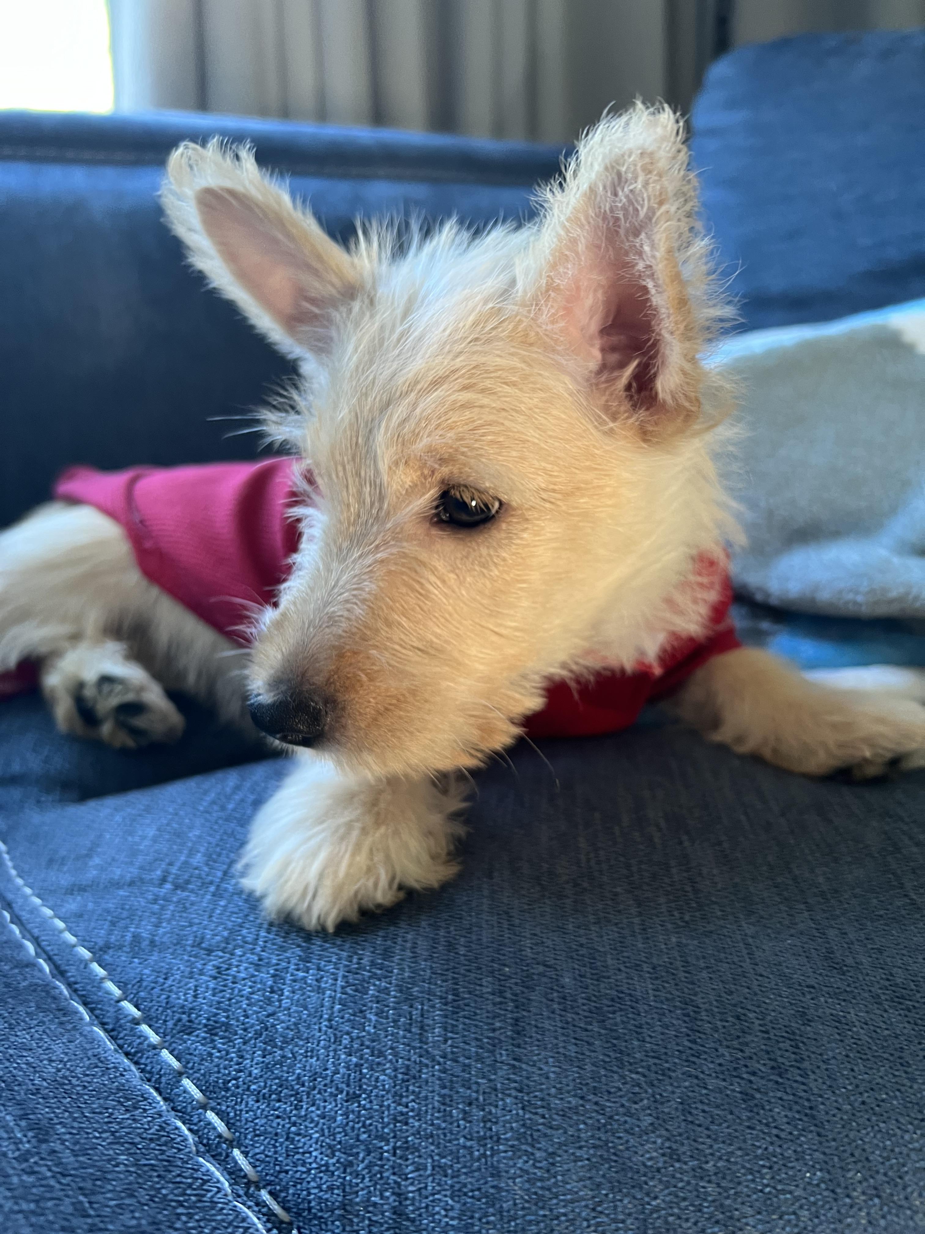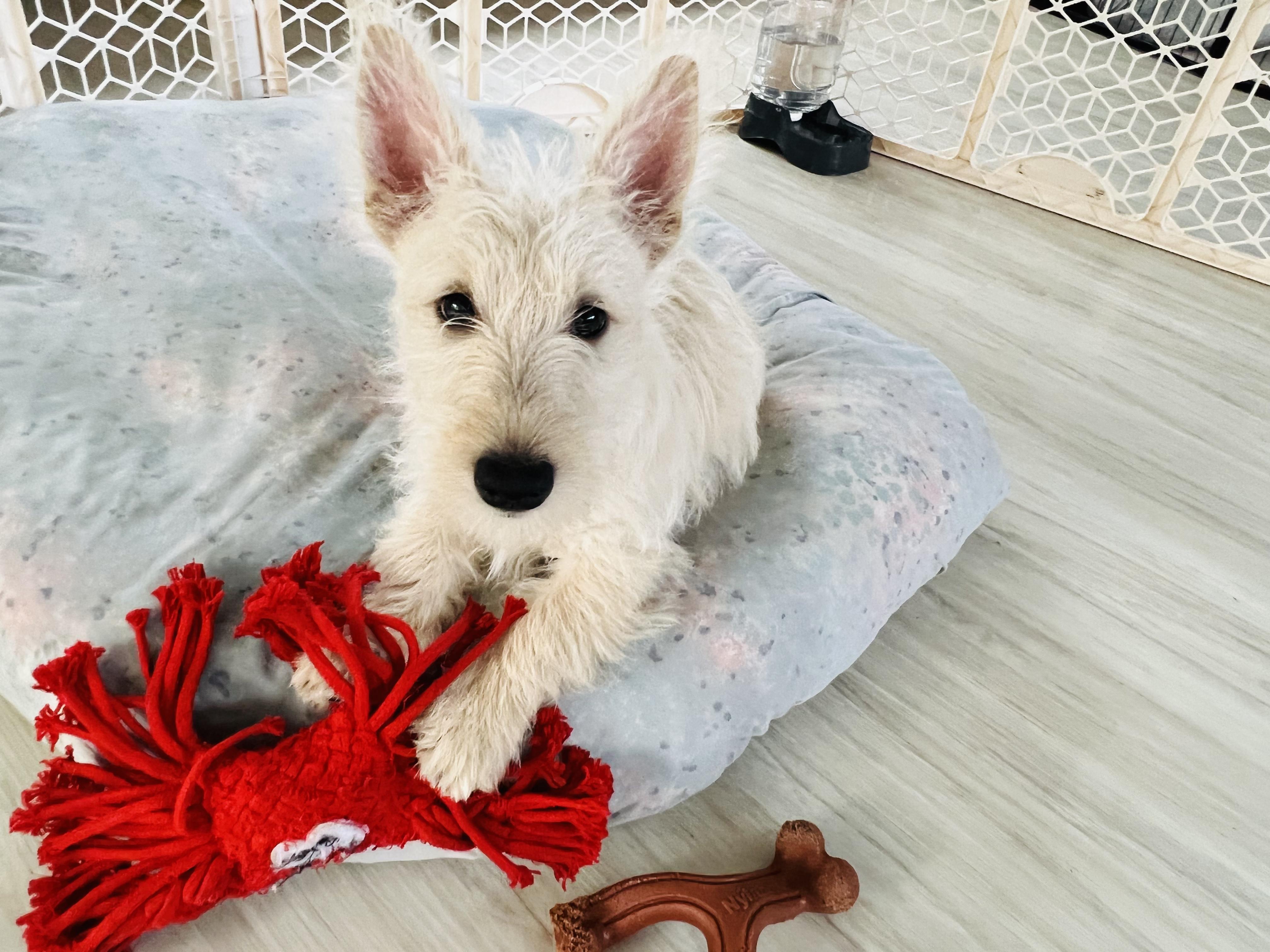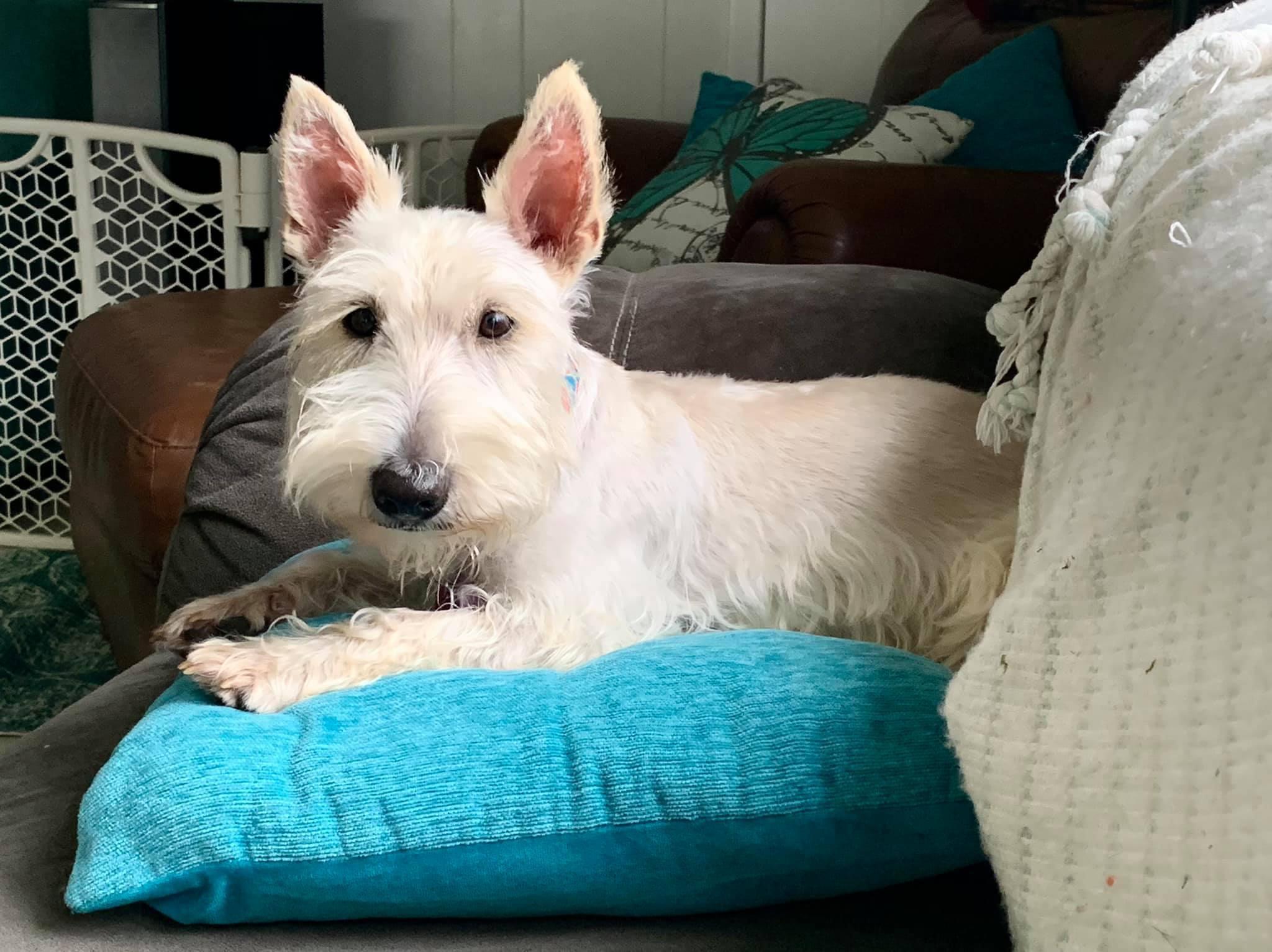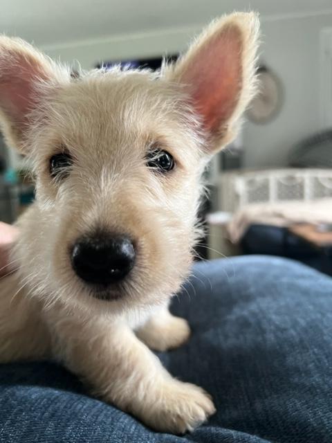 Alaska is a beautiful white wheaten Scottie. She’s incredibly athletic and loves to be outside hunting for squirrels and groundhogs and chipmunks, regardless of rain or snow. At night, she sleeps deeply at the end of our bed. She’s gorgeous and sweet!