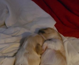 “Puppies will have beginning training in potty training, sit, lay down, come when called and to wait. We do offer extended training for an additional fee. They are raised in our home and are very social. They are vet checked, appropriate vaccinations and worming.”