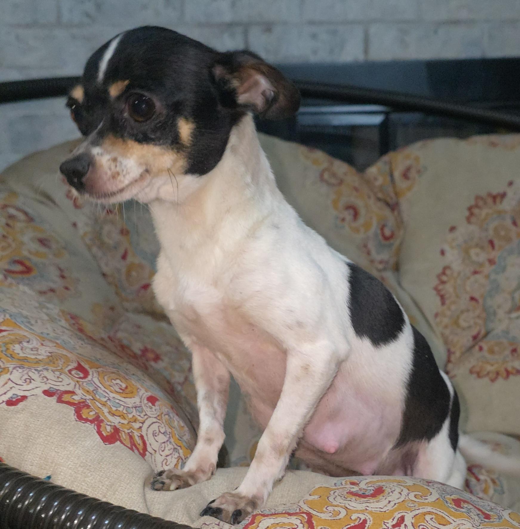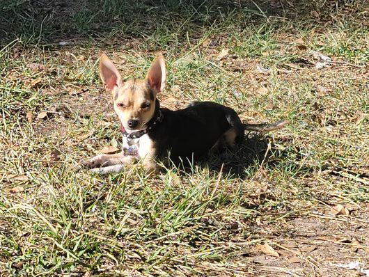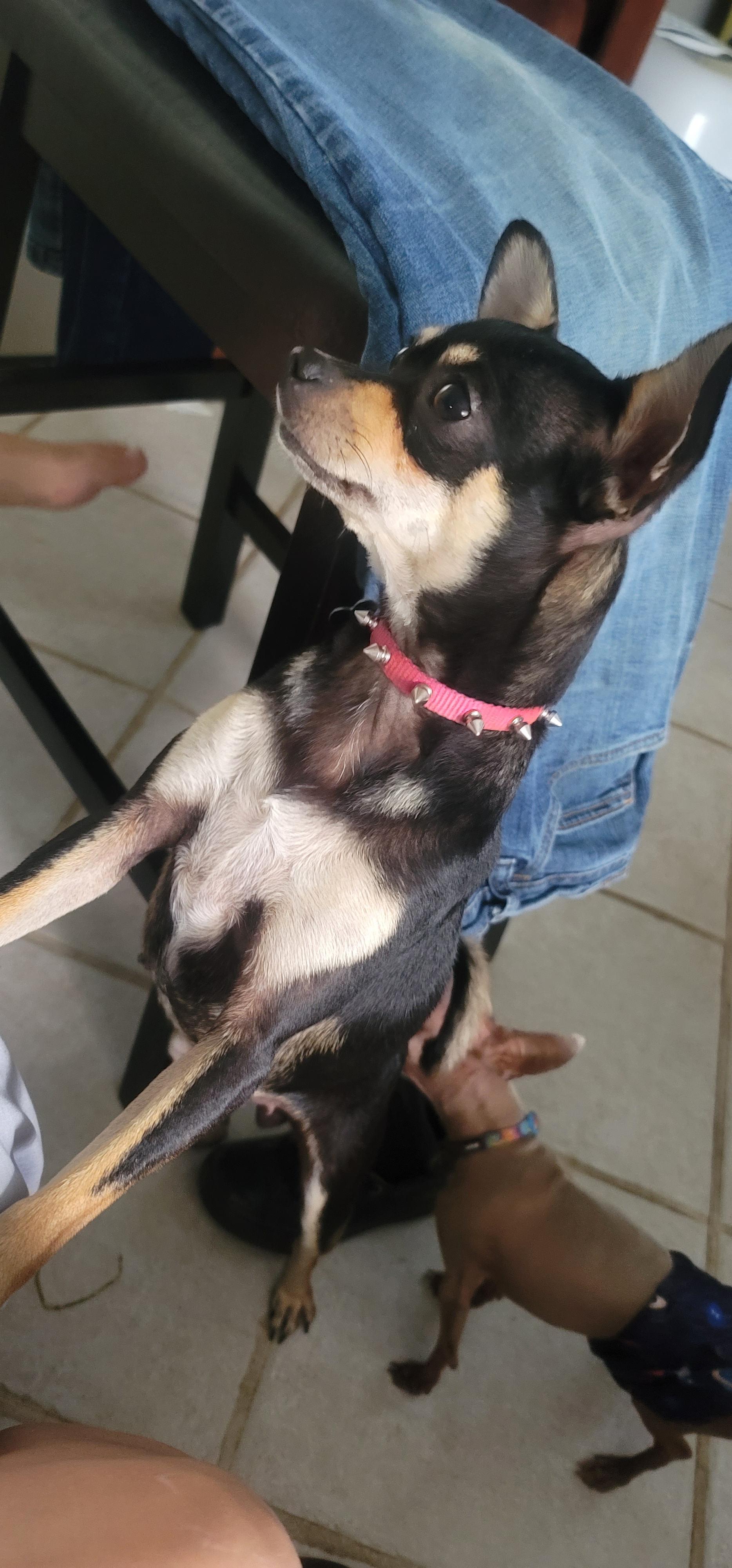 Black tri, from Guanajuato Mx. (Imported). Gives loving and kisses to all the kids. Has typical characteristics of a deer head chihuahua. Is very affectionate and loves going to the park and playing fetch.