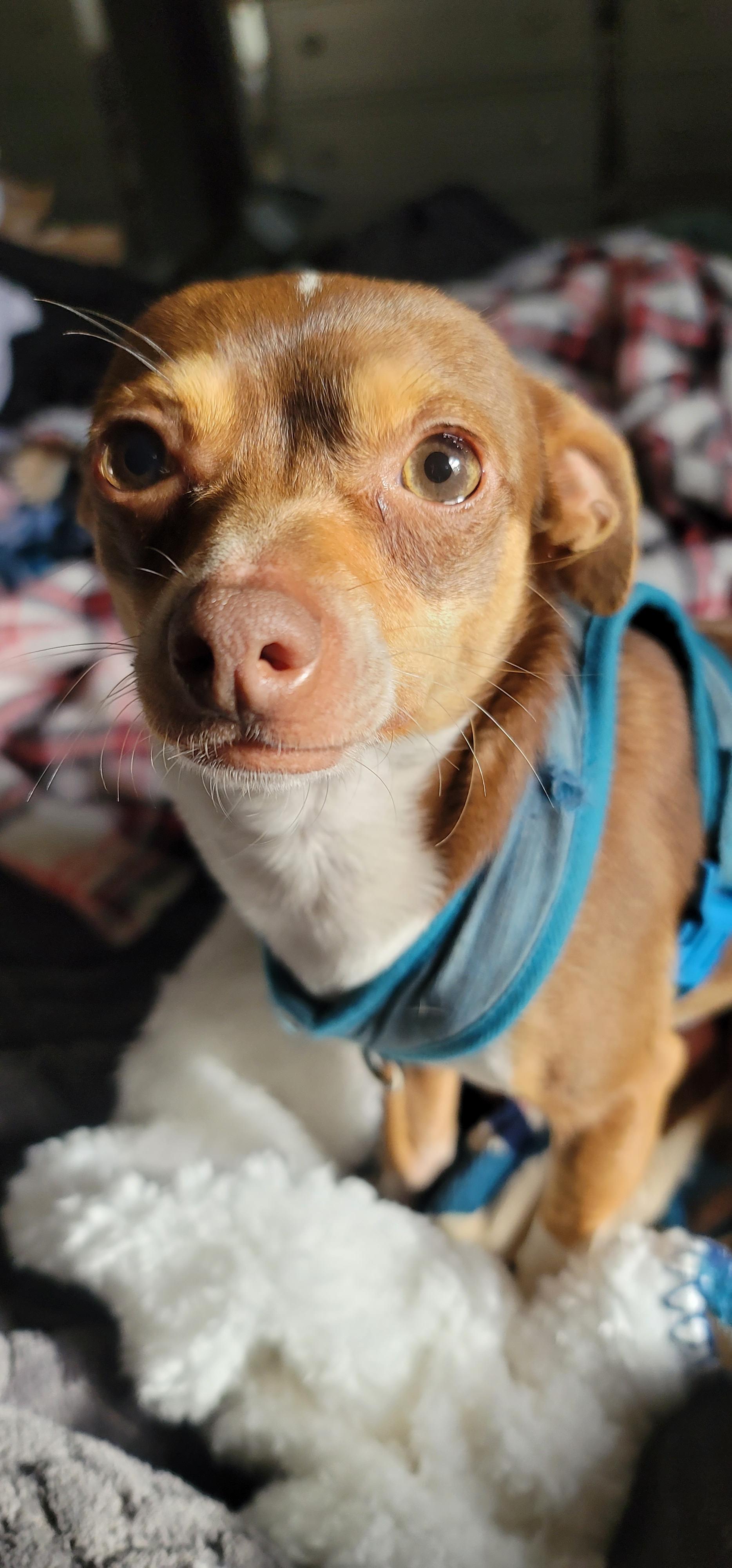 Taller deerhead chihuahua. Nice thick body and disposition. She's friendly but protective over our home. She is curious and loves to be watching everything from our laps.