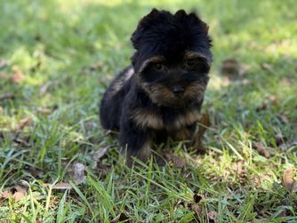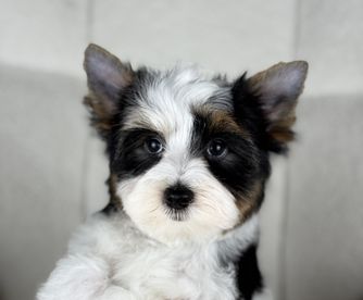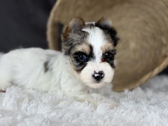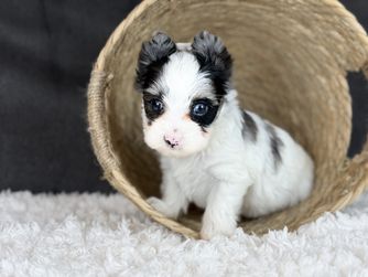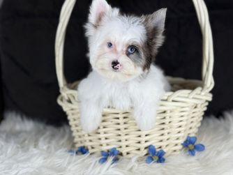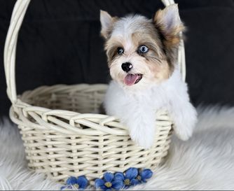 Our Chihuahua puppies include merle, chocolate, white, blue and tan, chocolate and tan, blue merle, and black and white. Yorkshire Terrier puppies include chocolate, tan and white, chocolate and tan, parti, and black and tan. Colors will vary depending on the parent dogs.