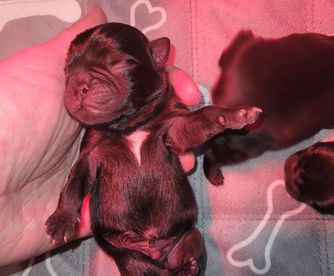 Bruno is what we call a "velcro dog." If Bruno could become my conjoined twin, he would. He is very cuddly and stays close by. He has a love-hate relationship with squeaky toys. He will 100% sneeze on your face and then give you kisses. DNA tested and in perfect health.