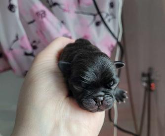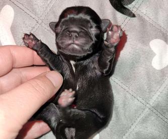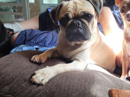 Bruno is what we call a "velcro dog." If Bruno could become my conjoined twin, he would. He is very cuddly and stays close by. He has a love-hate relationship with squeaky toys. He will 100% sneeze on your face and then give you kisses. DNA tested and in perfect health.